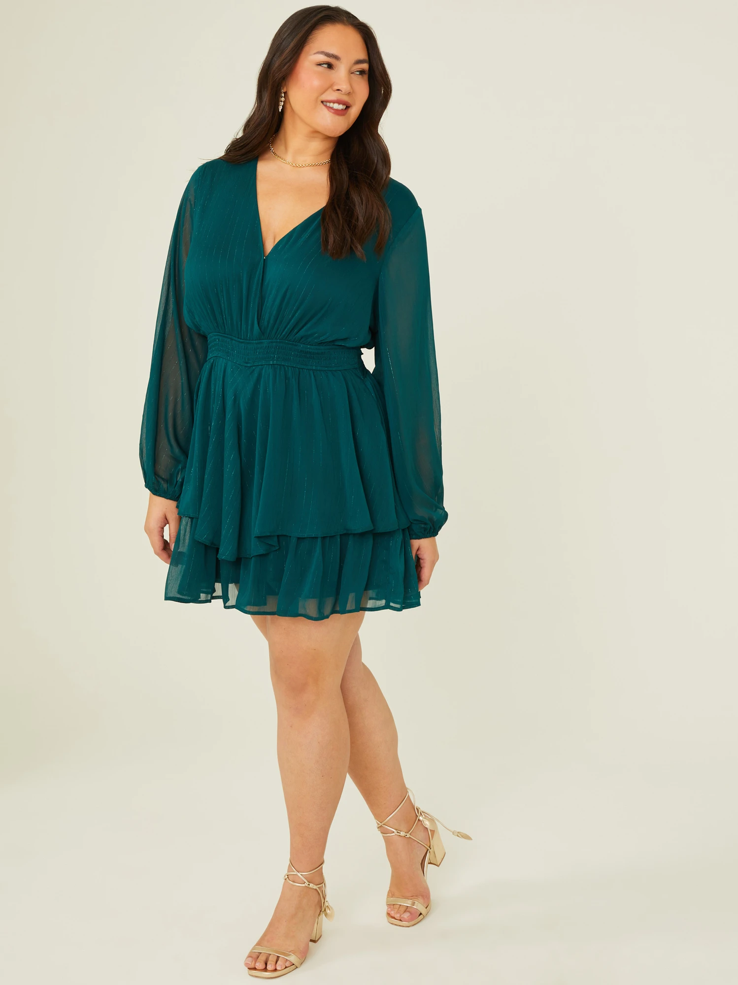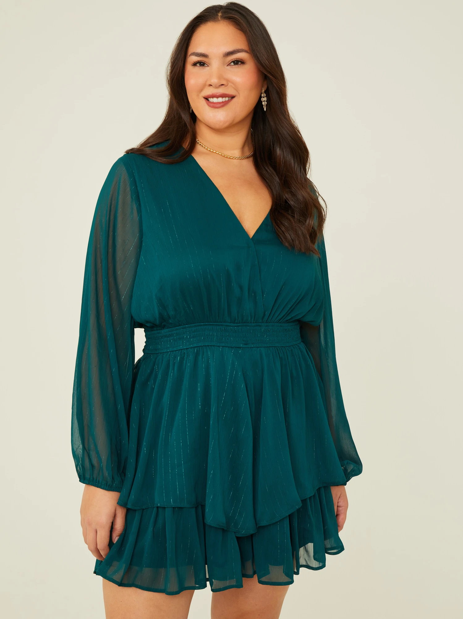 The delicate sheer material is adorned with a lurex shine, creating a shimmering effect that catches the light beautifully! The elastic waistline and adjustable tie at the waist provide a flattering fit, while the snap closure at the bust adds convenience and style. A tiered skirt overlay completes the look, making this romper an adorable choice for a night out or any event.
