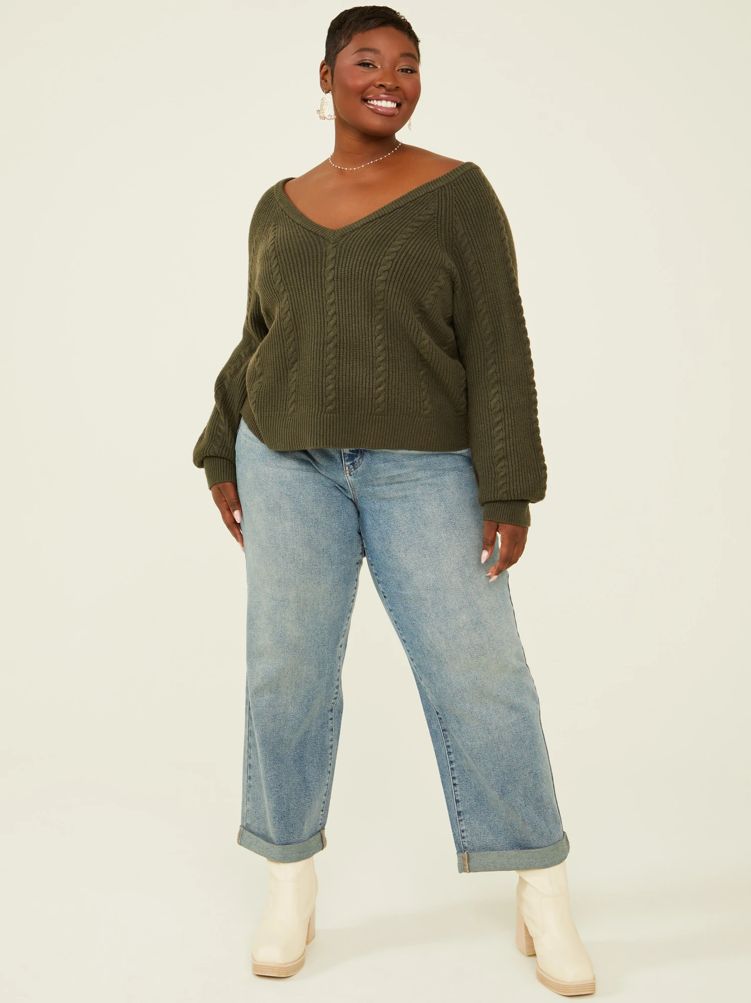 The epitome of cozy chic that wraps you in warmth and style, this classic cableknit sweater will be your new favorite go-to for the upcoming season. The v-neck design is both flattering and versatile, allowing you to pair it with your favorite accessories or wear it on its own. It’s perfect for both casual outings and more formal affairs.