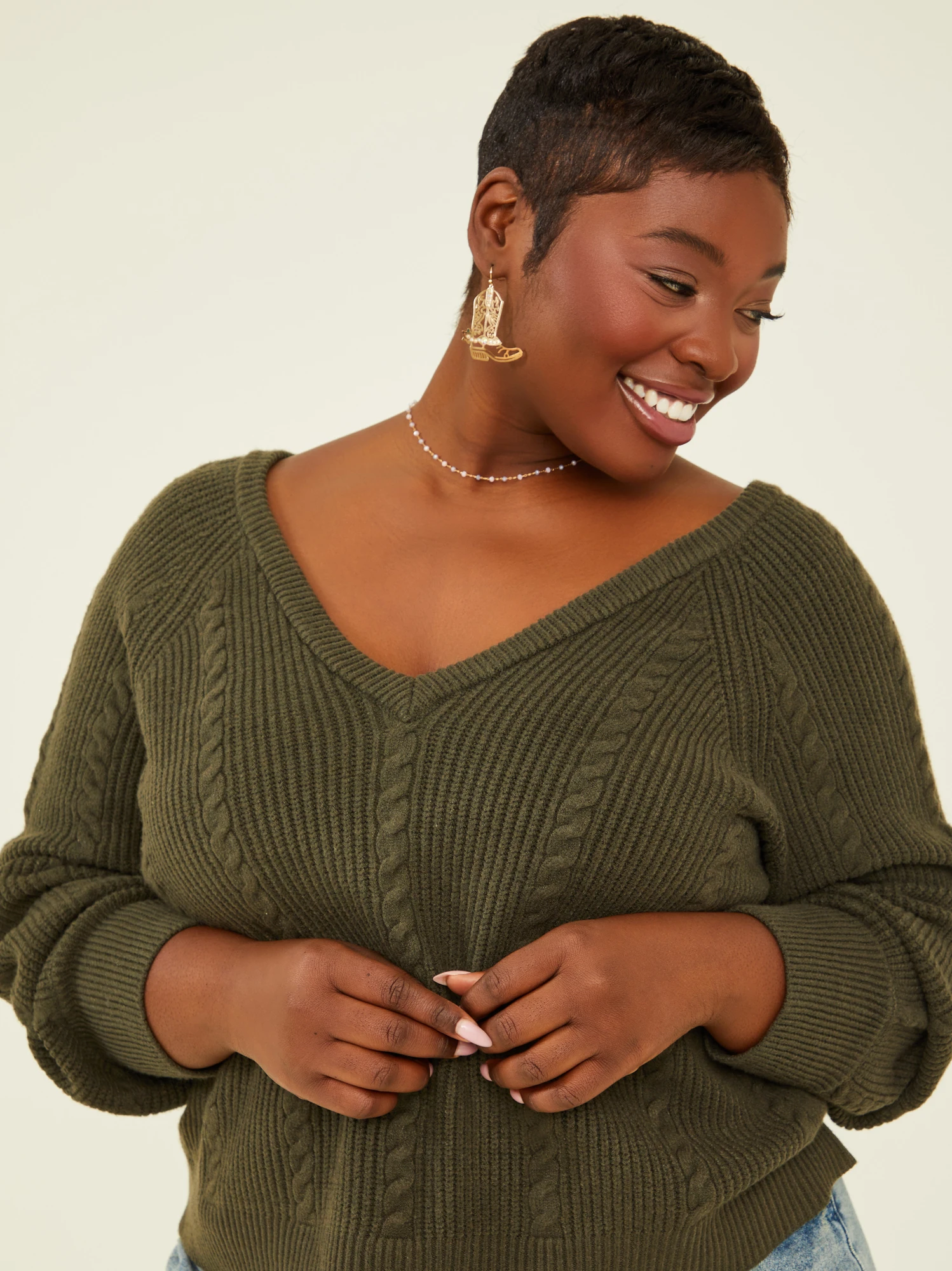 - Cableknit, V-neck