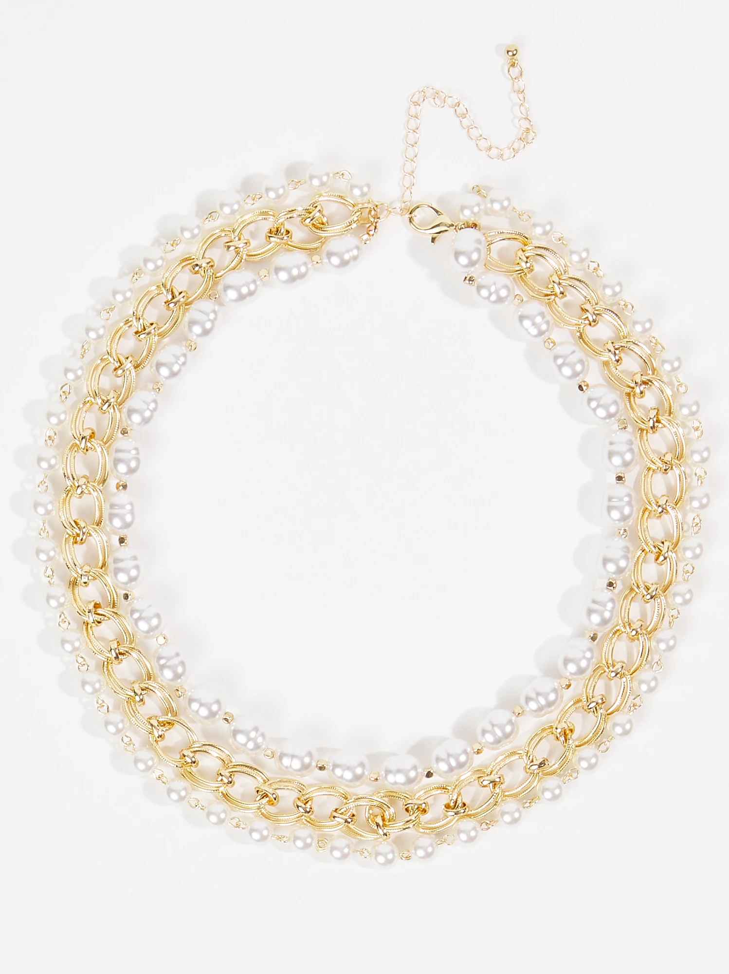 This adorable necklace is a true statement piece that effortlessly combines the timeless elegance of pearls with the radiant allure of gold chains. Designed to capture attention, this necklace is a versatile accessory that can elevate any outfit, from casual to formal.