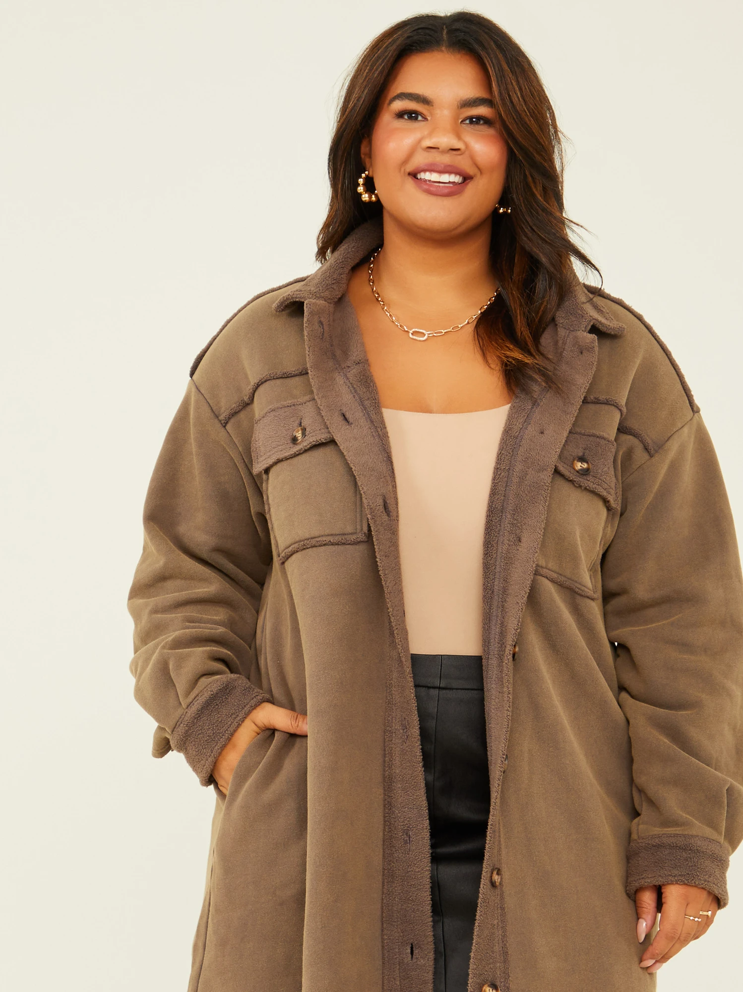 Update your cooler weather wardrobe with this comfy and cute shacket. The maxi-length design is not only on-trend but also provides extra coverage and warmth, making it an excellent layering piece. Whether you’re dressing up for a casual brunch or creating a chic street-style look, this shacket effortlessly adapts to any occasion.