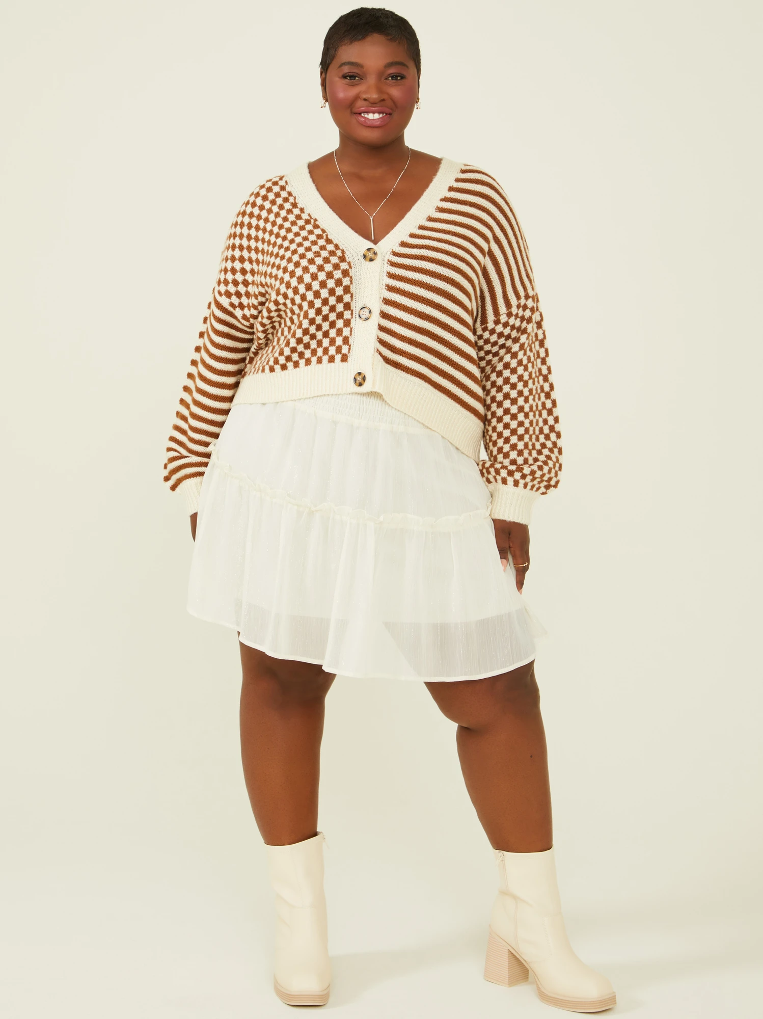 Designed with a blend of neutral colors, this knit cardigan effortlessly matches any ensemble, making it an essential layering piece for all seasons. This cardigan combines the timeless charm of mixed patterns with a flattering cropped hemline. Layer on your favorite vintage graphic tee, basic bodysuit, or maxi dress to complement your unique style.