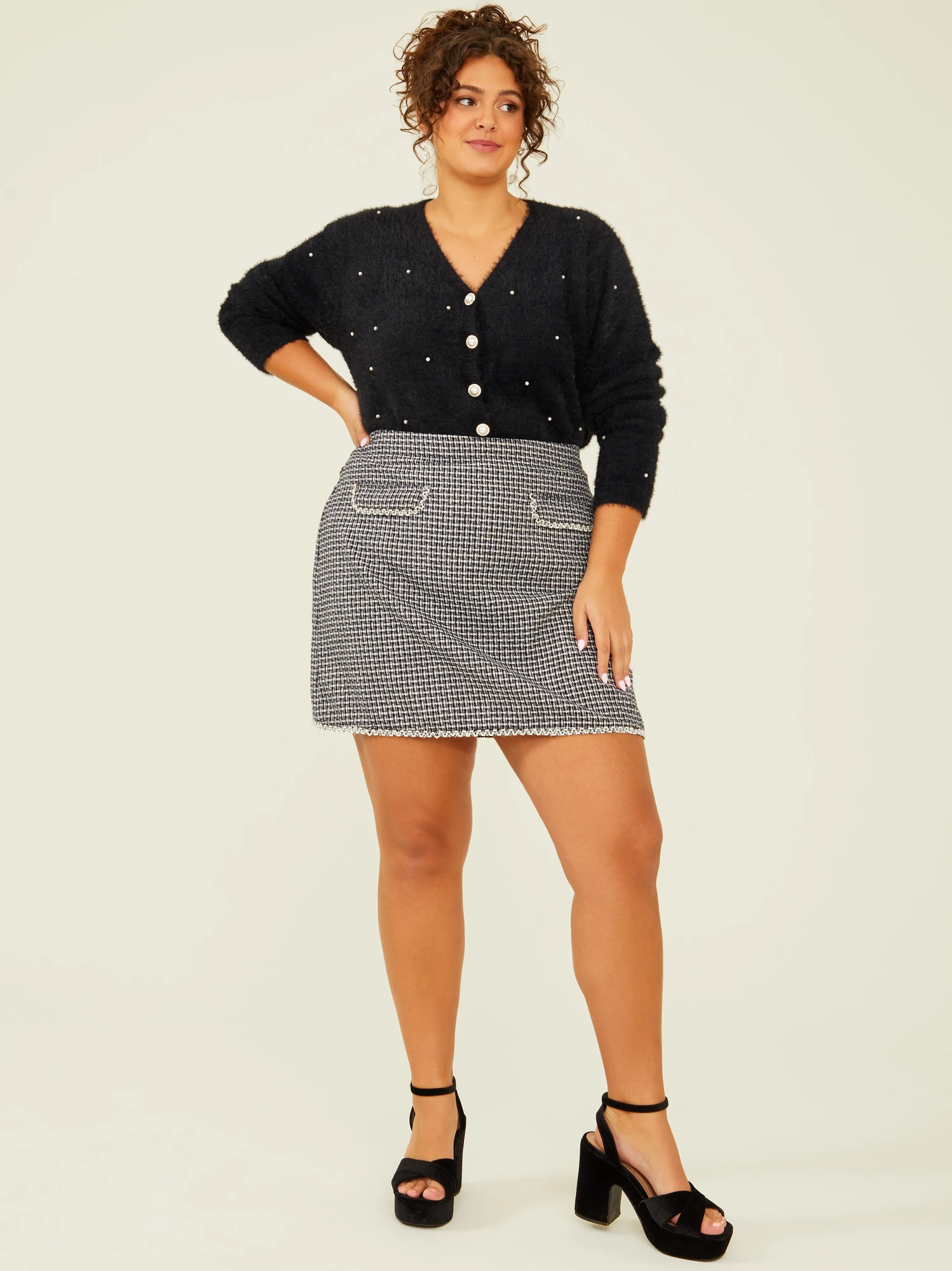 This skirt boasts a houndstooth tweed touch that pays homage to traditional fashion, offering a refined and polished appearance. The subtle yet eye-catching pearl and shimmer embellishments add a touch of luxury and glamour, making it suitable for various occasions from the office to evening soirees.