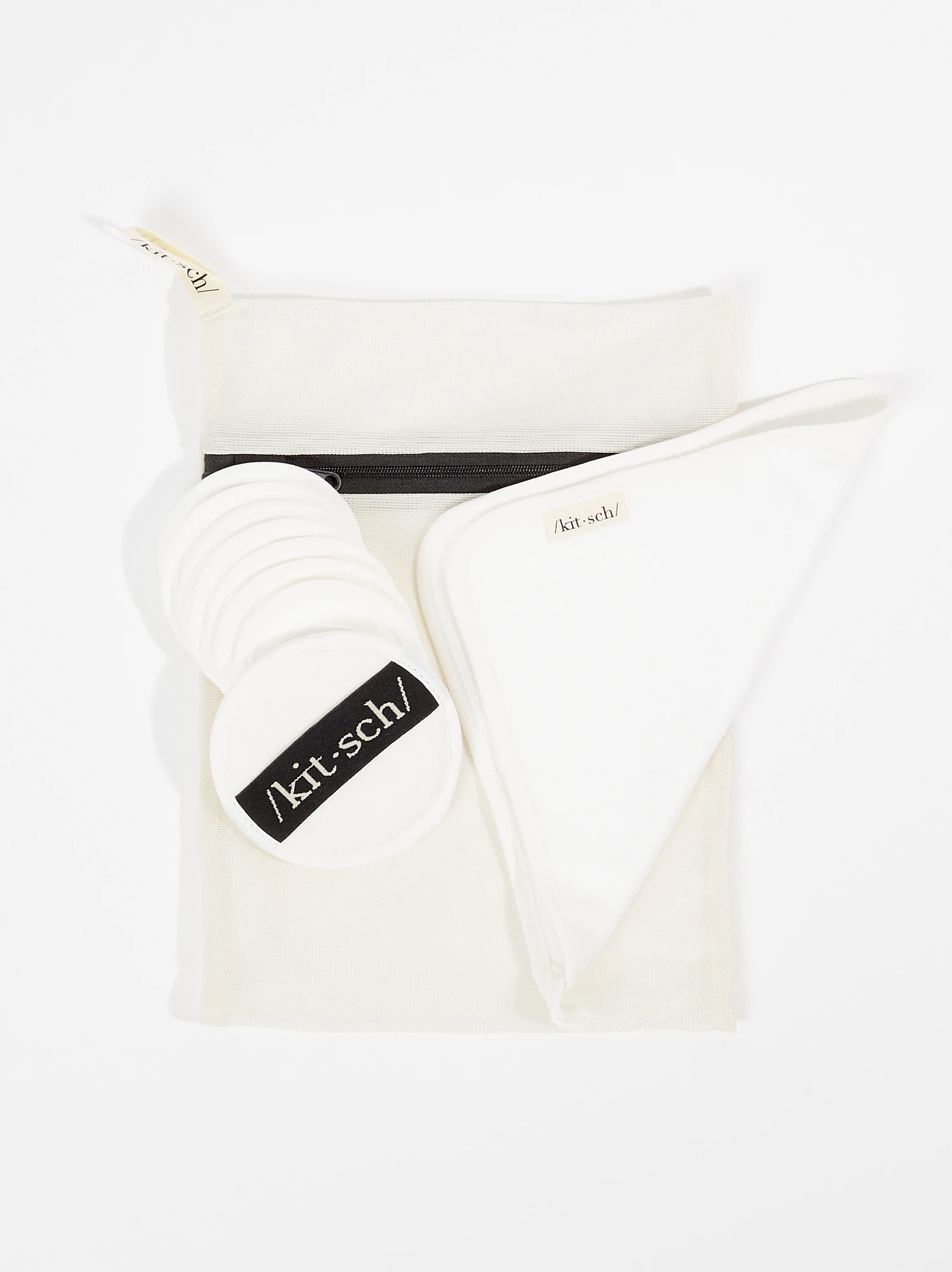 - Includes mini face rounds, exfoliator sponge, face towel, & mesh zip wash bag