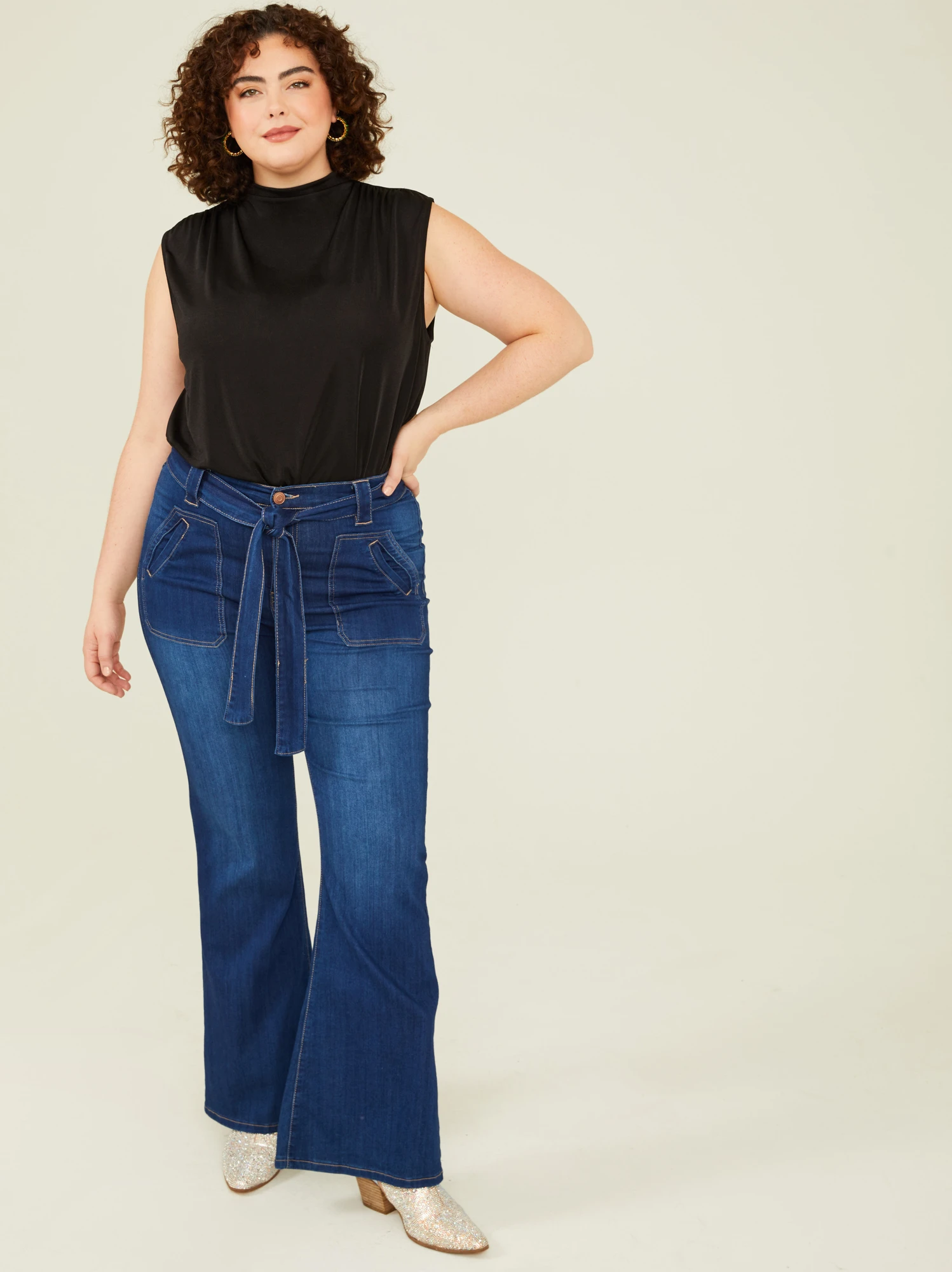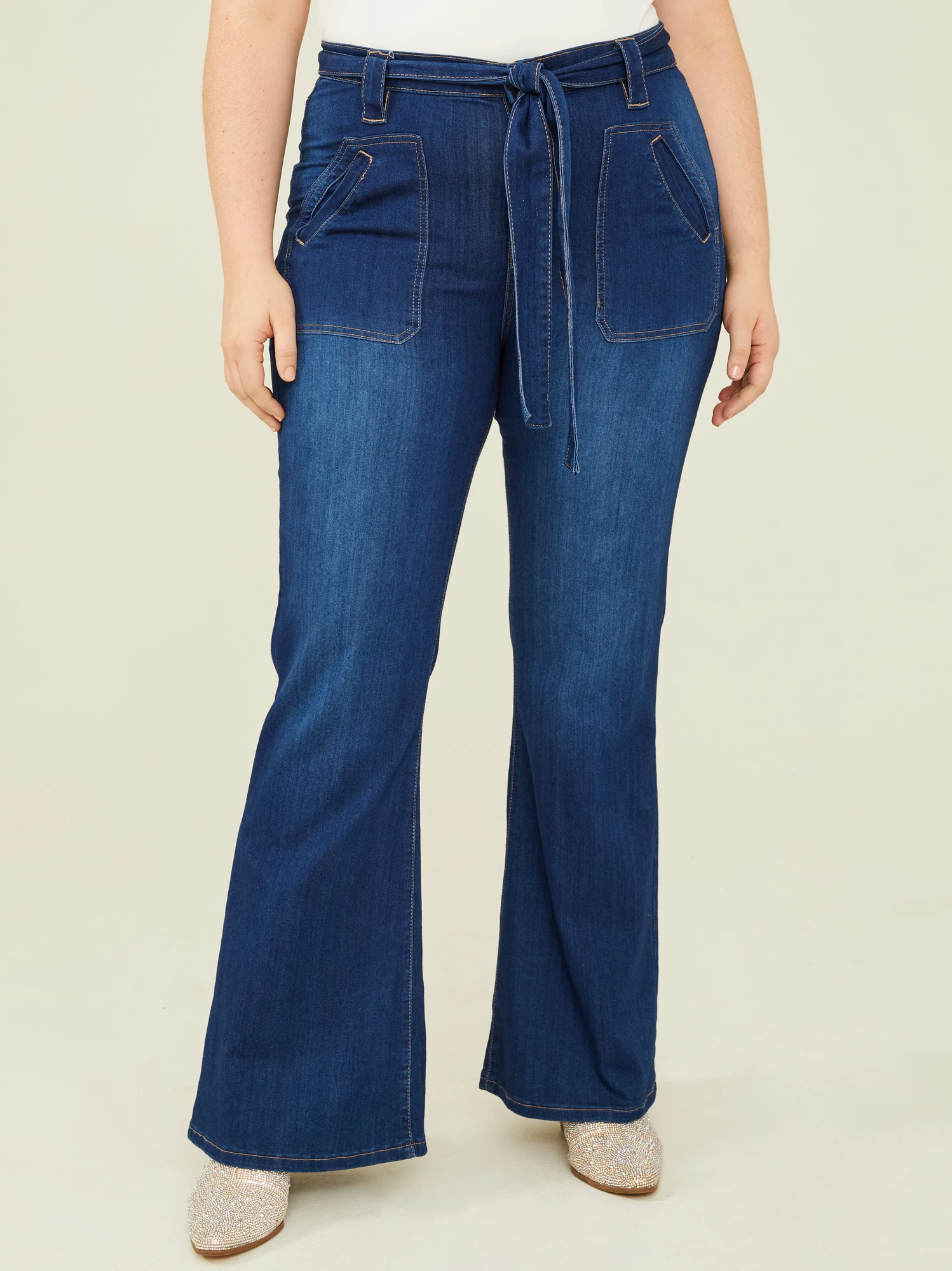 These stretchy high-rise jeans have flattering front exterior pockets and a special belted waist! The tried and true medium wash is oh-so timeless with the classic exposed stitching, and the flare hem is perfect for wedges or heeled booties.