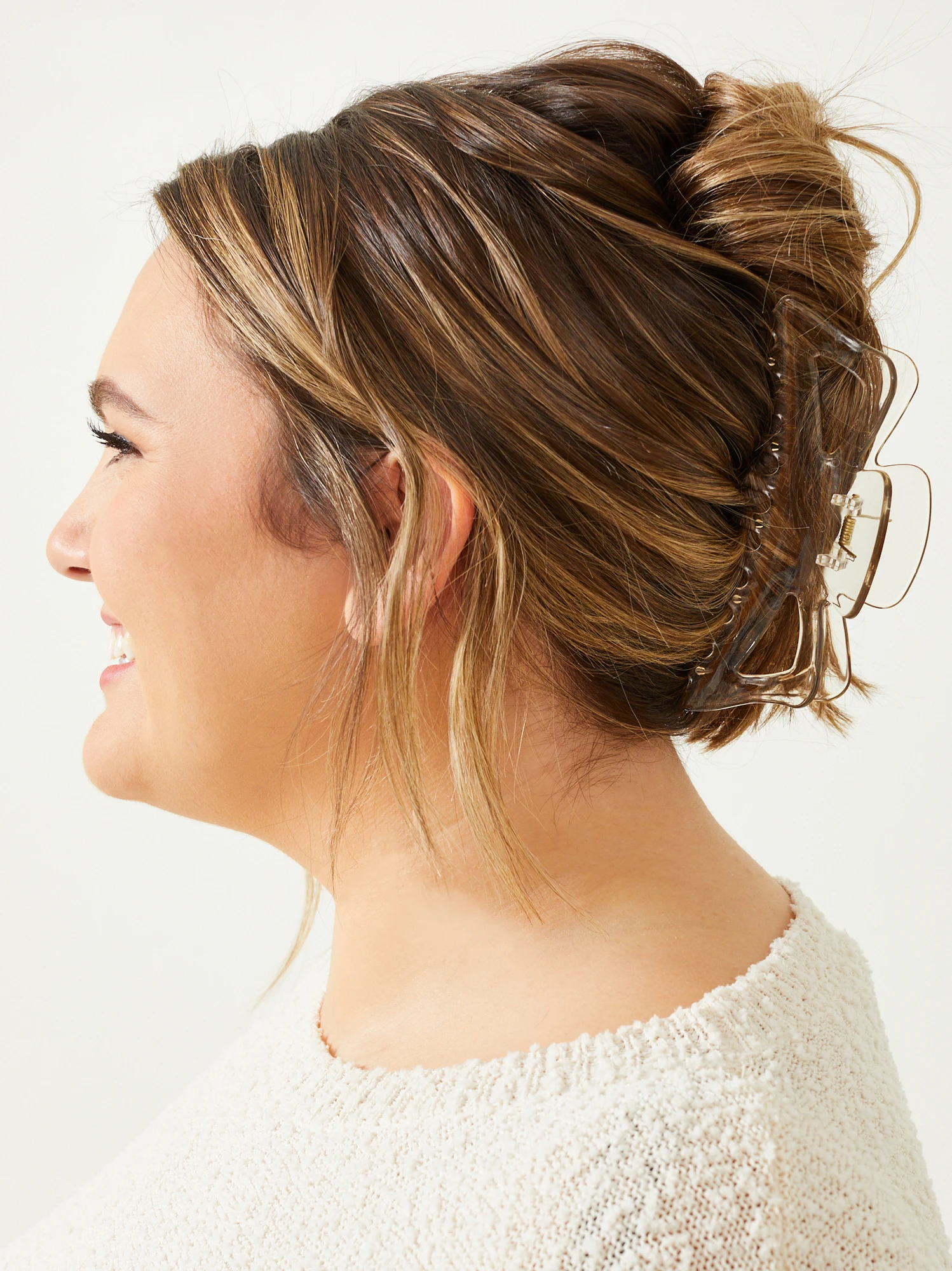 Pull back your hair with this adorable claw clip! This timeless hair accessory features an oversized shape met with a classic, chic look. Effortlessly add to your outfit with neutral, boho style!