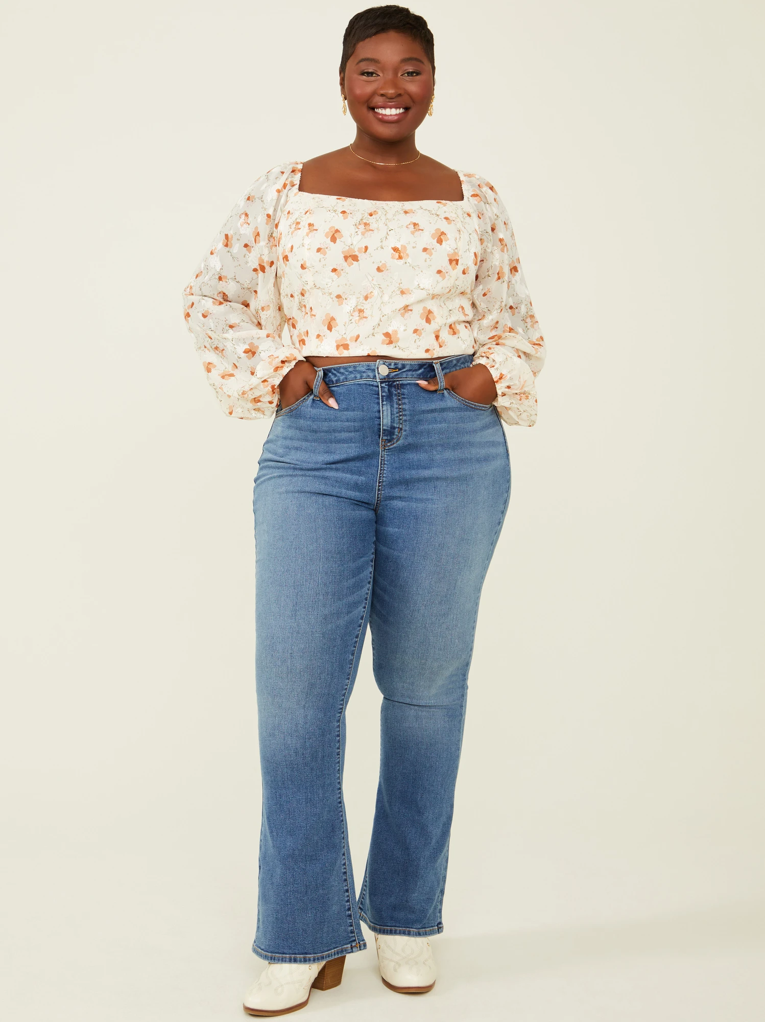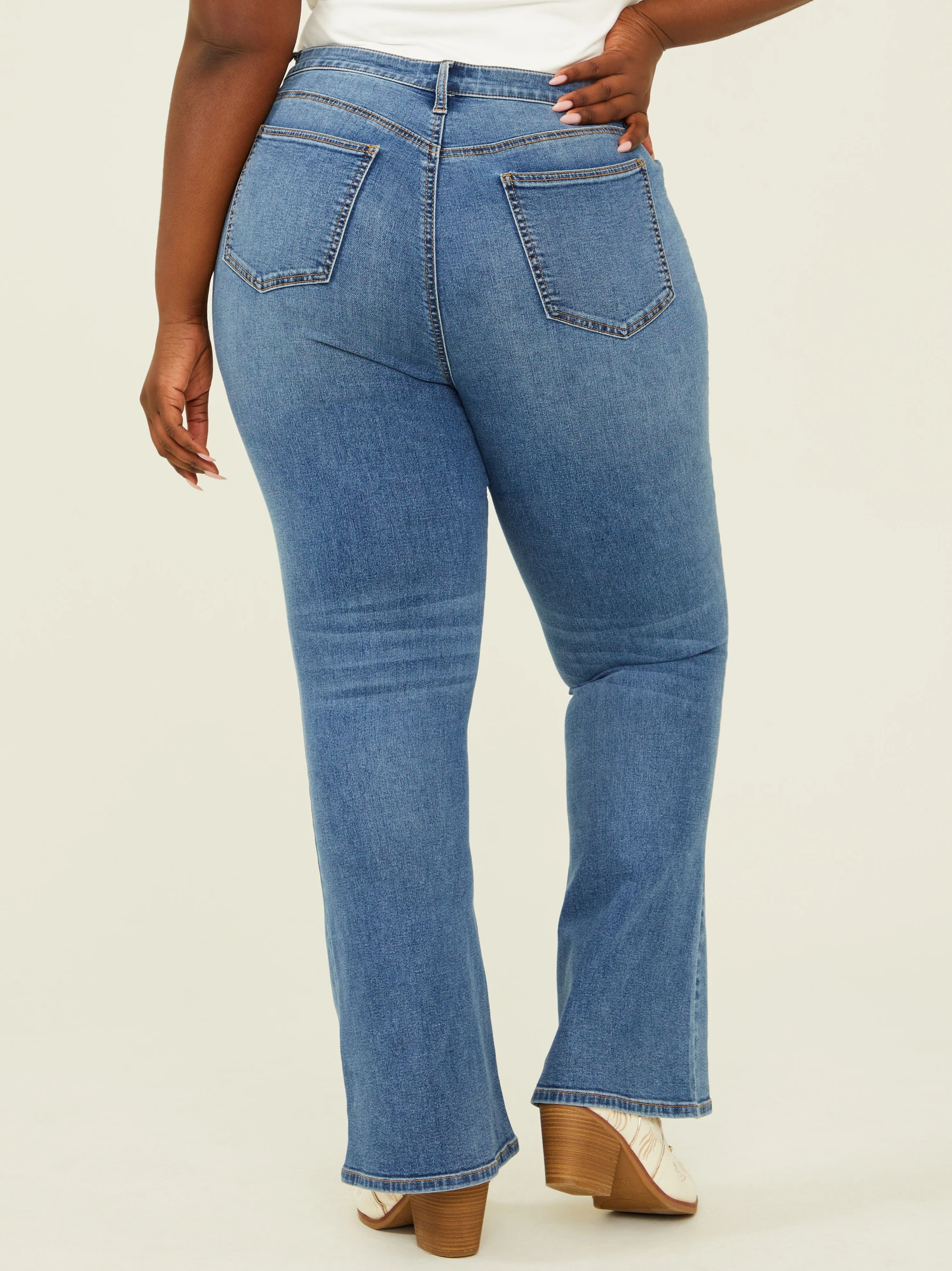 - Fit: High-rise, Curve-hugging fit with flare hem