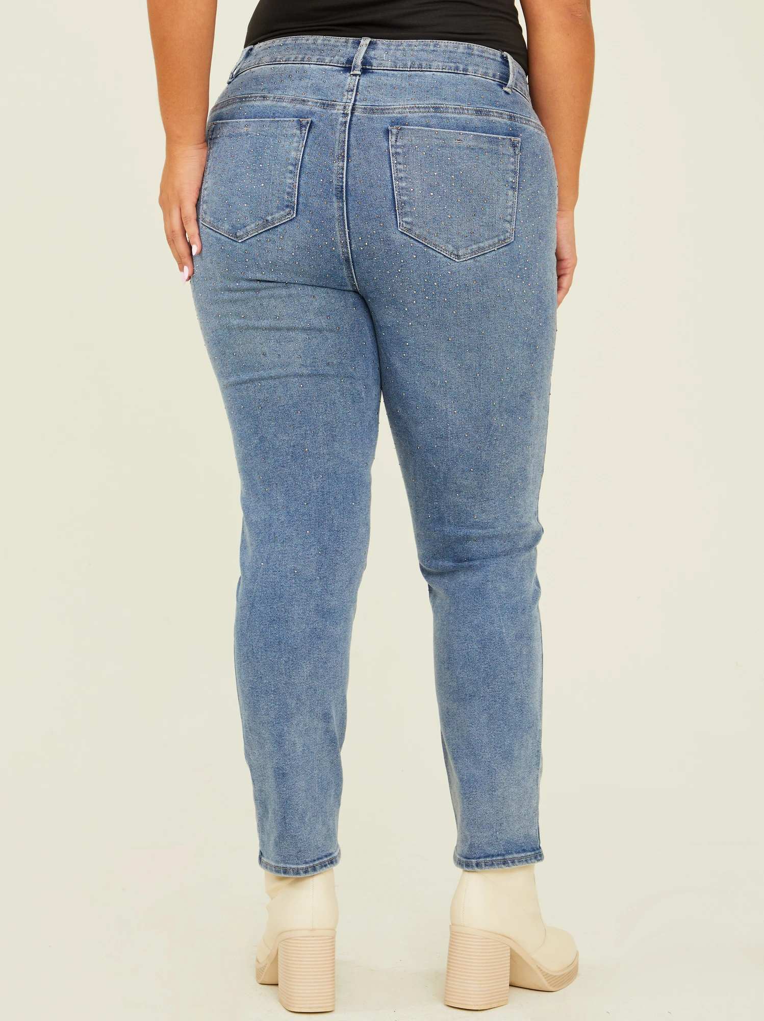 These chic studded jeans are the ultimate fashion essential designed to flatter your figure and turn heads. Crafted with a vintage wash that exudes a sense of nostalgia, these jeans capture the essence of classic denim while adding a touch of contemporary style. Perfect for those who want to make a bold statement with their fashion, these denim bottoms feature a stylish look.
