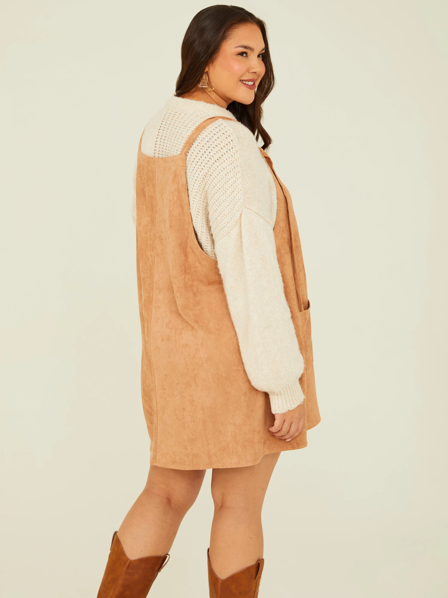 Featuring adjustable straps and a relaxed, curve-hugging silhouette, this suede skirtall is perfect for transitioning through the seasons. The suede texture adds a soft touch, and the two front pockets offer both style and convenience.