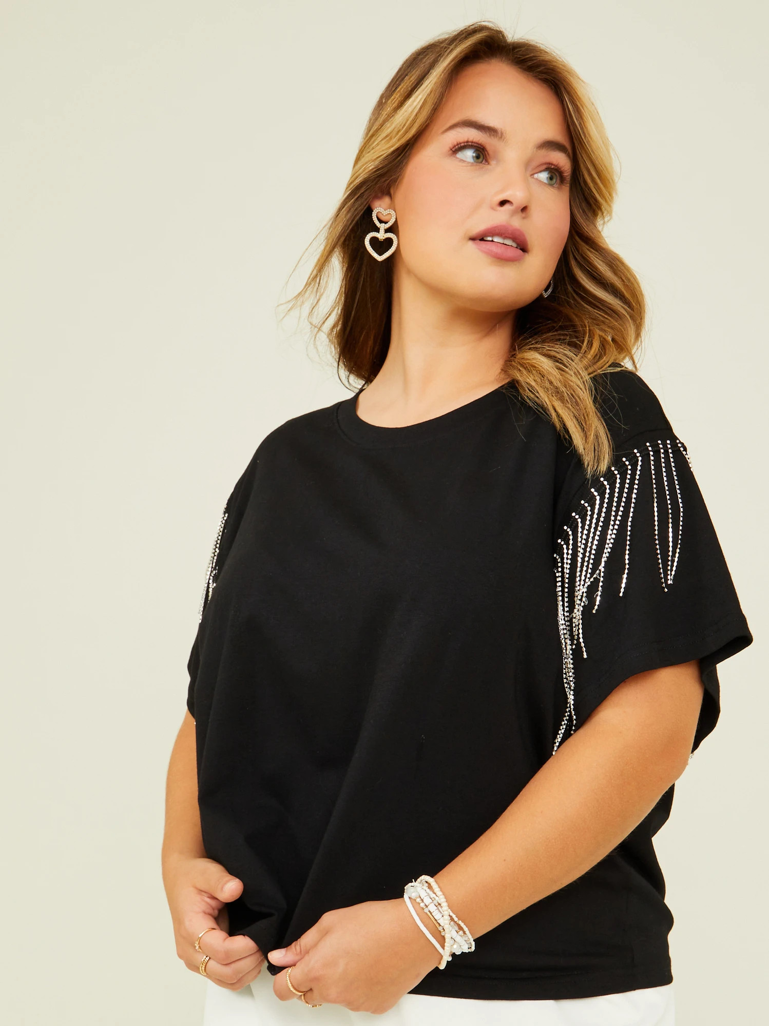 This glamourous and eye-catching top combines luxurious style with dazzling details to create a truly unforgettable look! Whether you’re headed to a special occasion or going to dinner with the girls, this top features pretty rhinestone fringe to add a touch of sparkle and movement to your outfit. Pair it with sleek pants and heels for a sophisticated and chic look, or style it with denim bottoms and booties for a more casual ensemble!