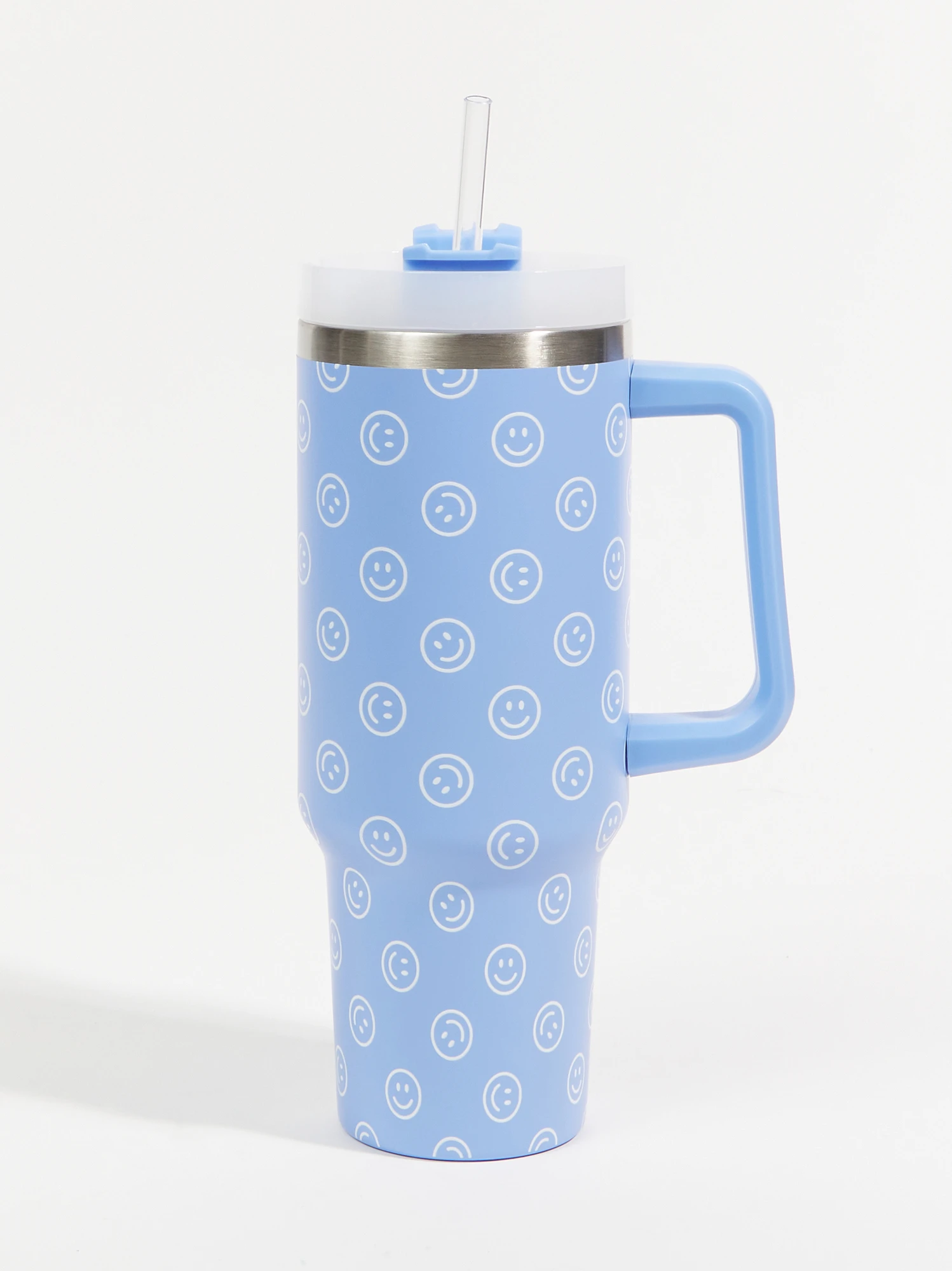 Stay happy and hydrated with this 40 oz tumbler! The secure lid and rotating cover top let you choose how to sip, while the stainless steel lining keeps your drinks hot or cold all day long. The easy-grip handle and narrow base make it perfect for on-the-go, and the fun design is sure to put a smile on your face.