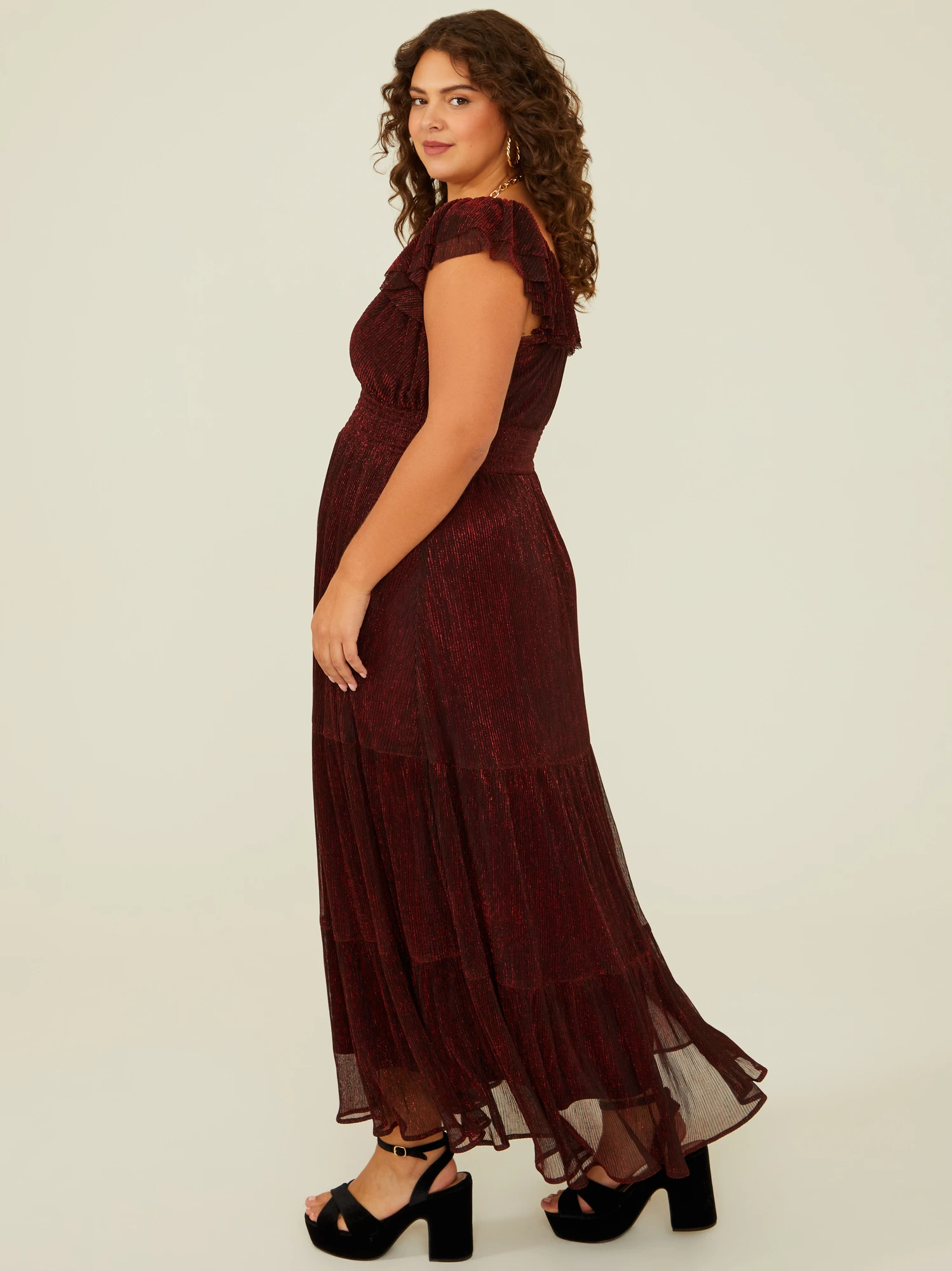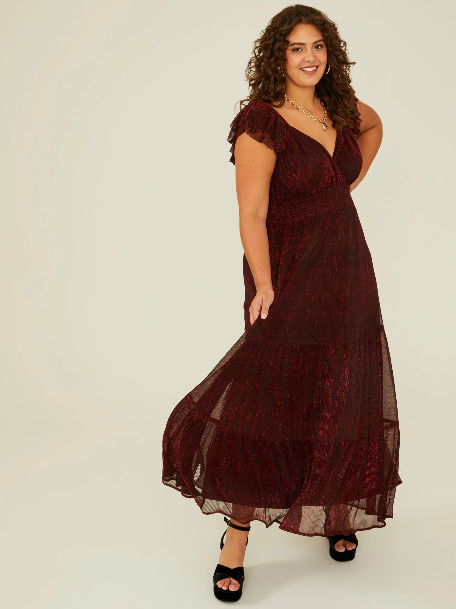 - Shimmer lurex threading, Elastic details, Flutter sleeves, Surplice neckline, Tiered skirt