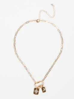 Elevate your style with our stunning gold necklace, featuring a contemporary paperclip chain adorned with celestial-inspired charms. Whether worn alone or layered, it’s a captivating piece that reflects your unique personality and love for the stars above.