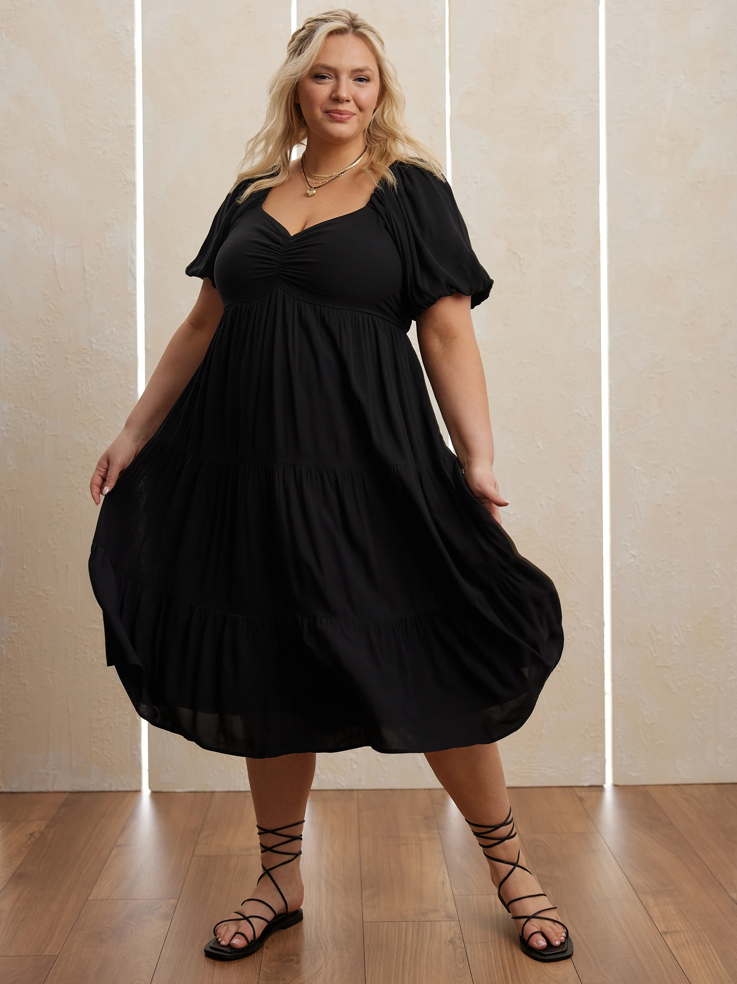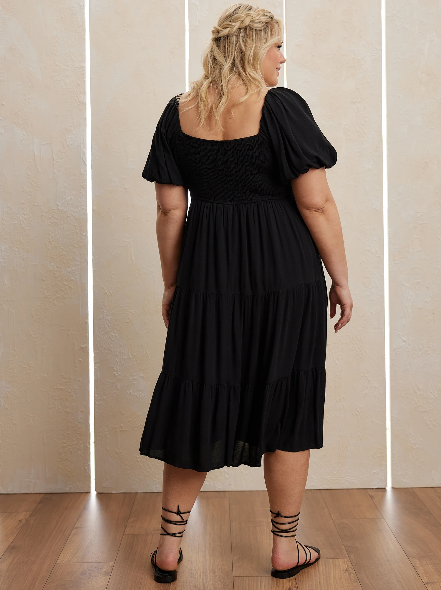 - Cinched bust, Puff sleeves, Tiered skirt, Smocked back detail