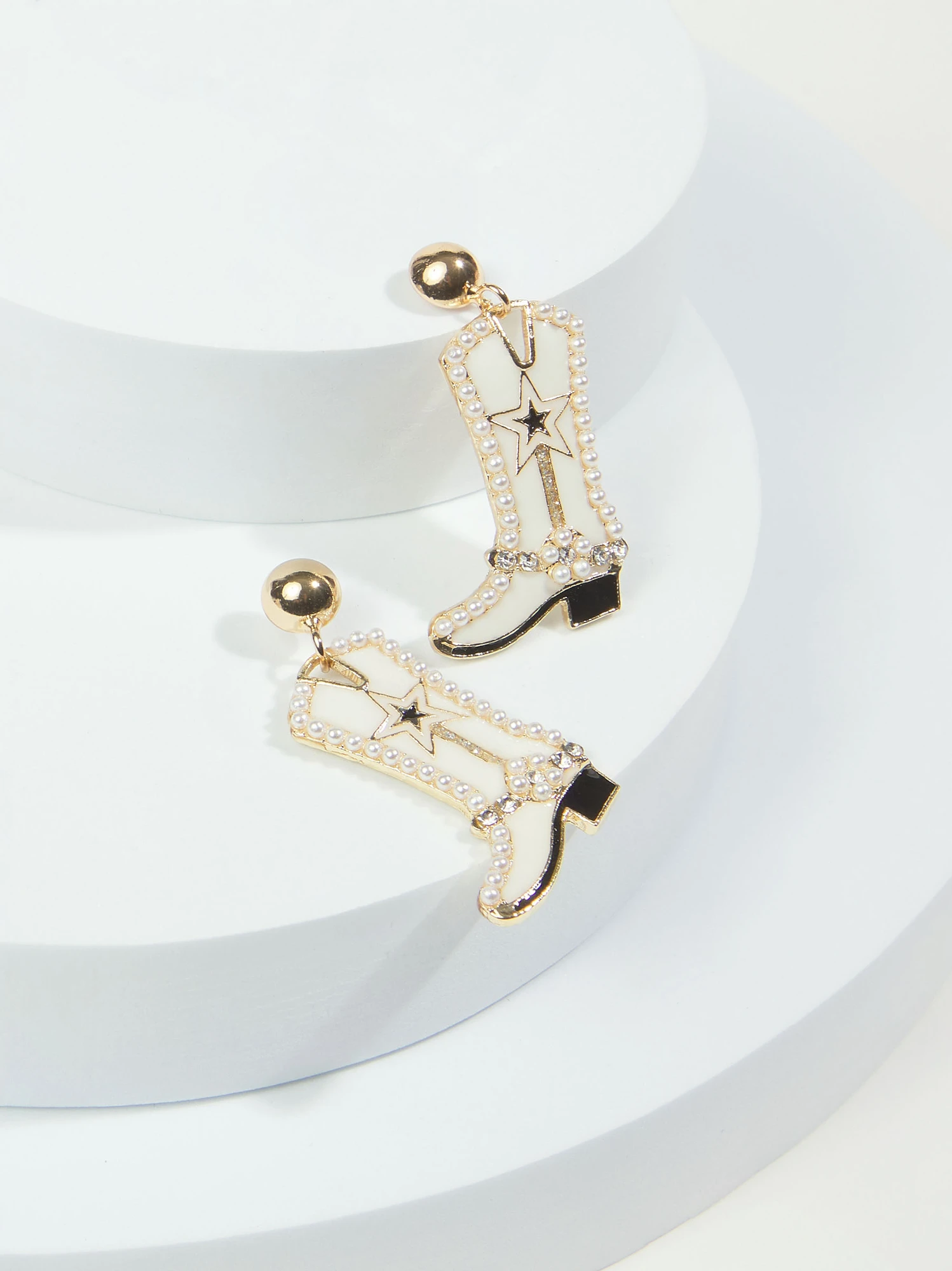 These trendy cowgirl boot earrings are complemented with feminine pearl accents! Dressed up or down, these dangles are the perfect accent for some western flair. Effortlessly dress up your flannel and booties with these one-of-a-kind beauties!