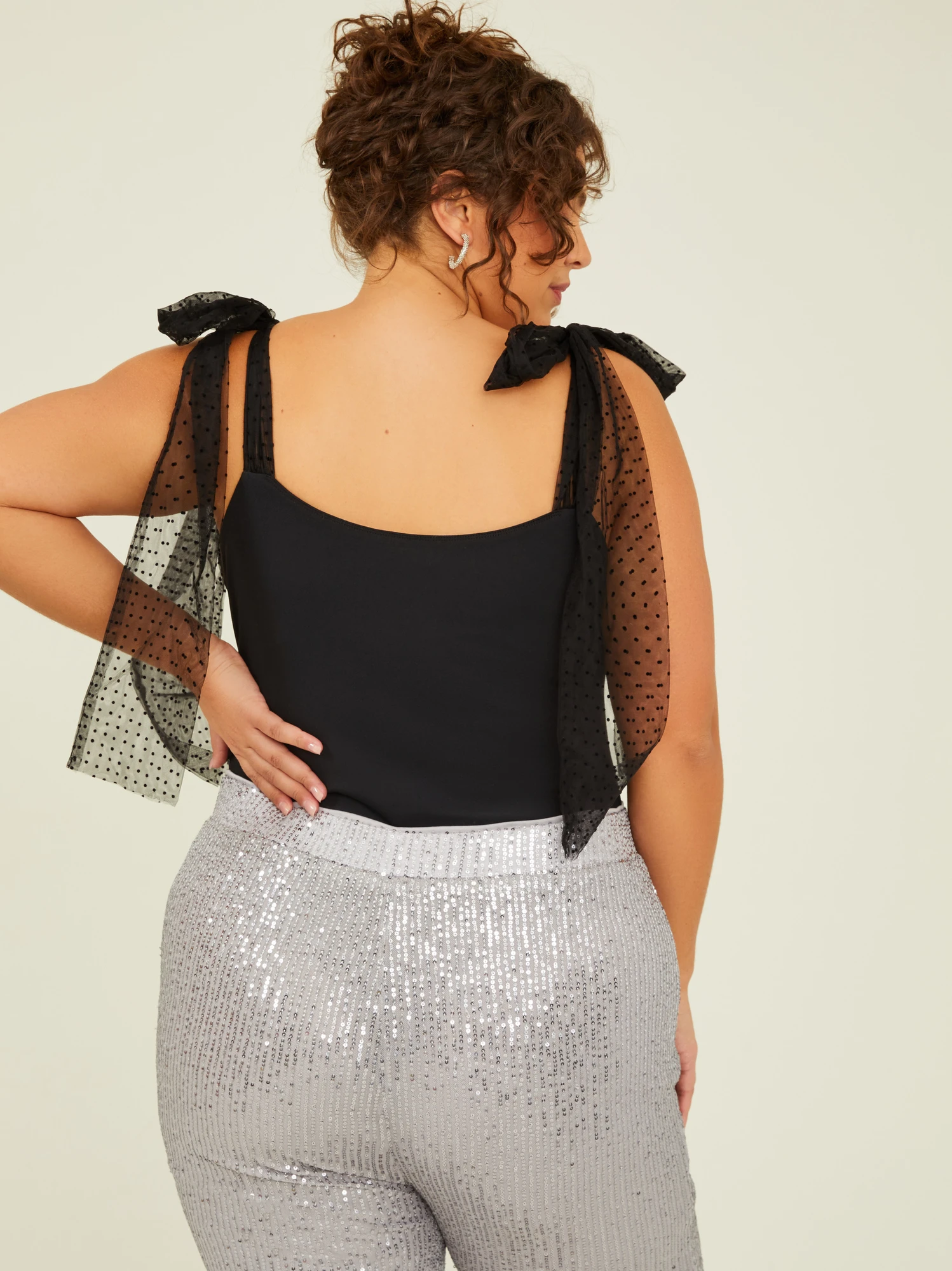 Complete your wardrobe with this double-lined bodysuit that offers unbeatable stretch and comfort. The square neckline adds a touch of modern elegance, while the adjustable velvet dot-printed mesh bow straps make it a truly unique and feminine addition to your collection.
