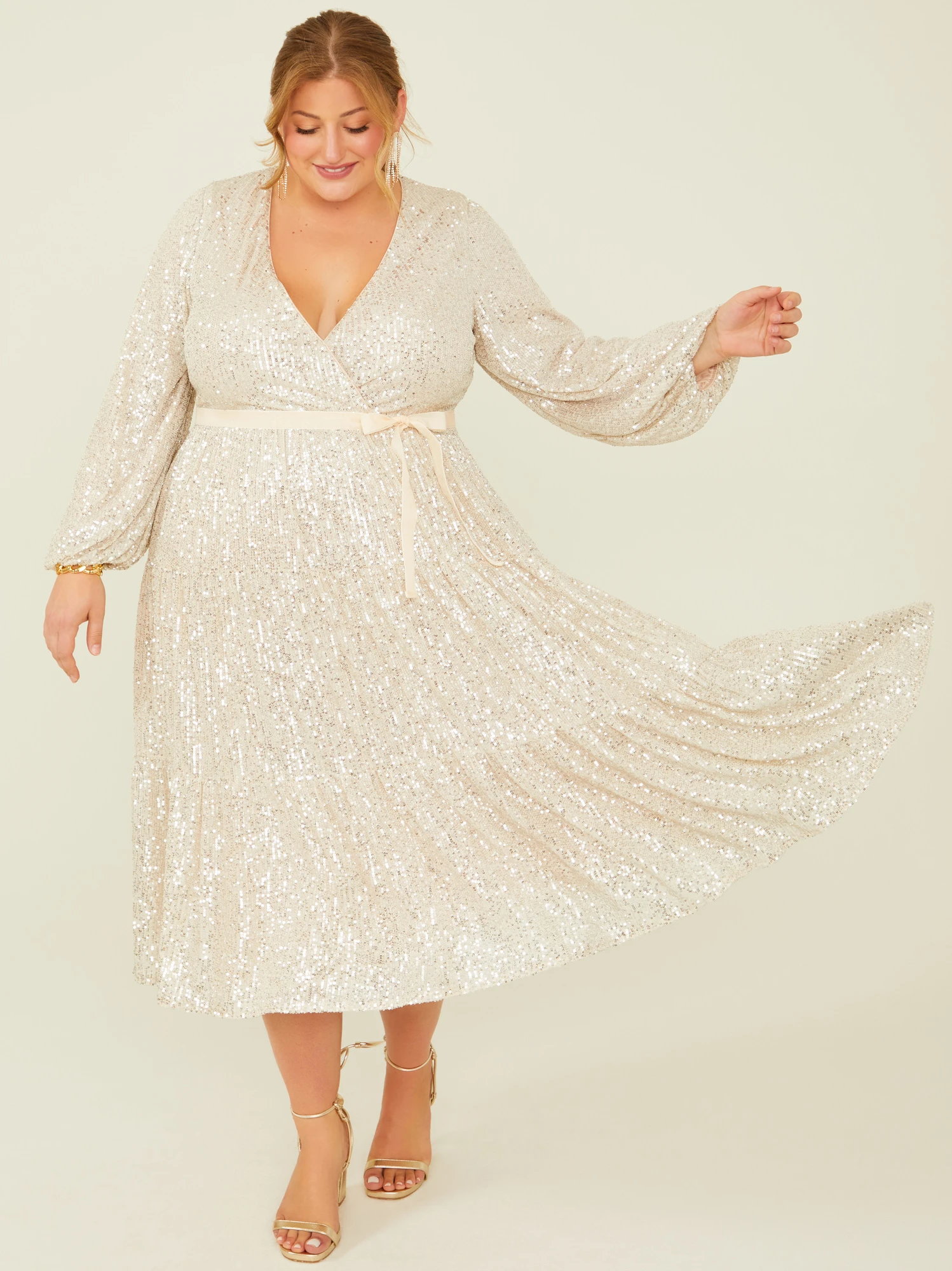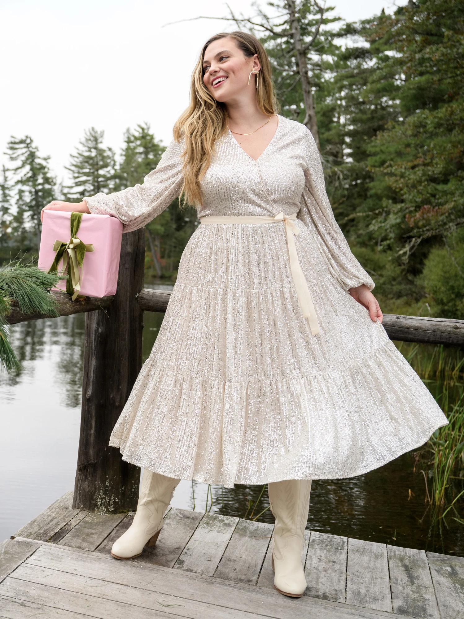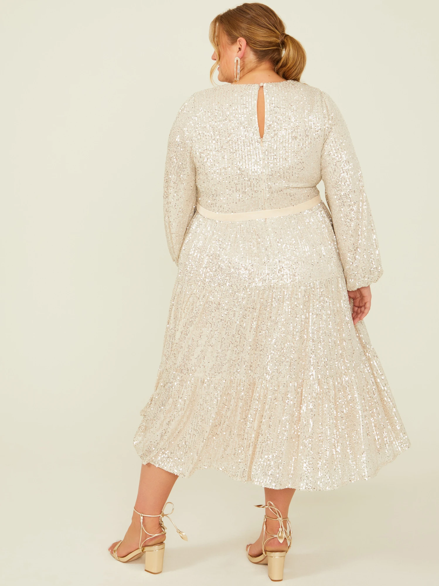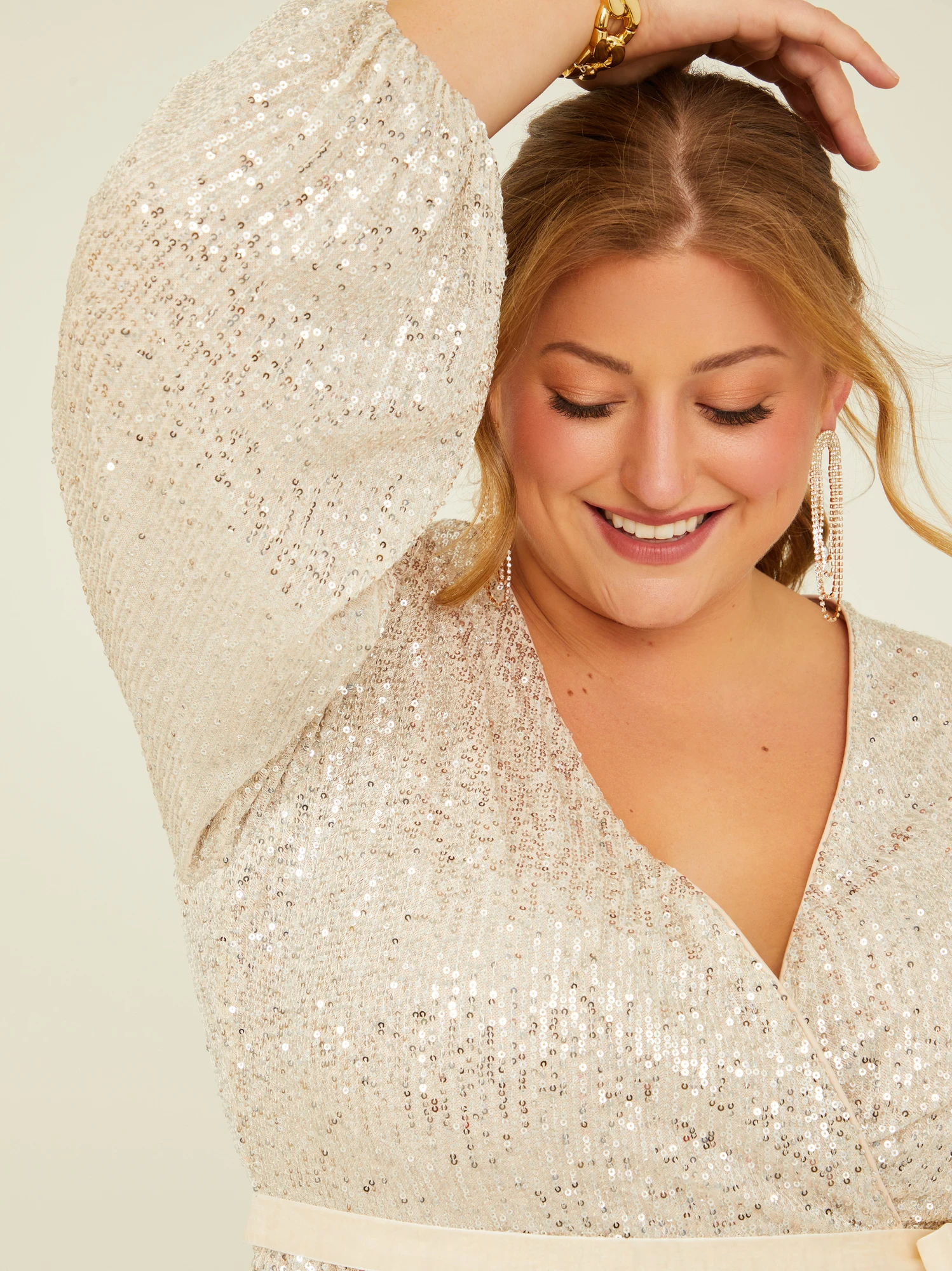 With a touch of shimmering sequins, a luxurious velvet belt, a flattering surplice neckline, charming puff sleeves, a tiered skirt, and hidden side pockets, this dress is an exquisite choice for any special occasion. Illuminate the night and turn heads with every step in this captivating ensemble.