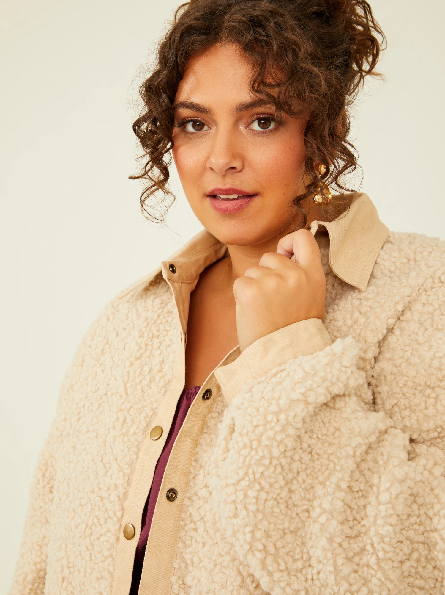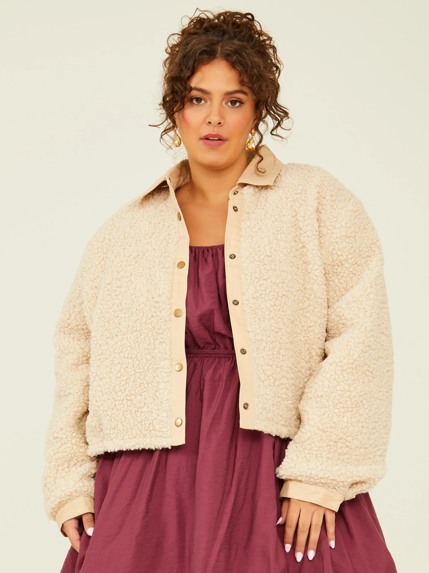 Refresh your winter wardrobe with this cropped jacket, ideal for layering with your favorite autumn sweaters and flannels. The sherpa fabric not only provides warmth but also offers a reversible option, allowing you to switch up your style effortlessly. Wear it with the plush sherpa side out for a cozy and casual look, or reverse it for a structured and stylish appearance.