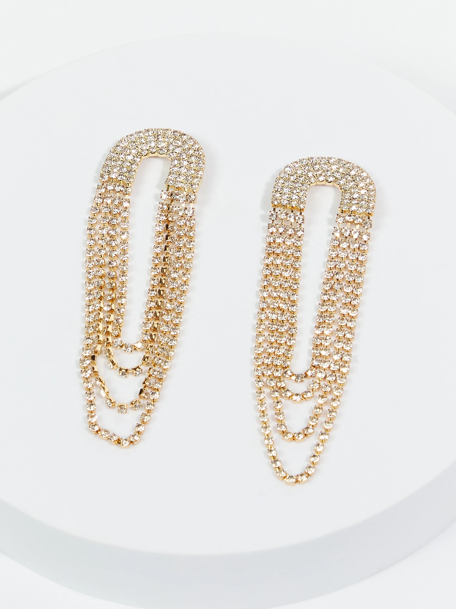 These earrings feature a mesmerizing array of rhinestones that adorn the graceful arches, creating an enchanting play of light and sparkle. Ideal for weddings, galas, or any event where you want to radiate elegance and poise.