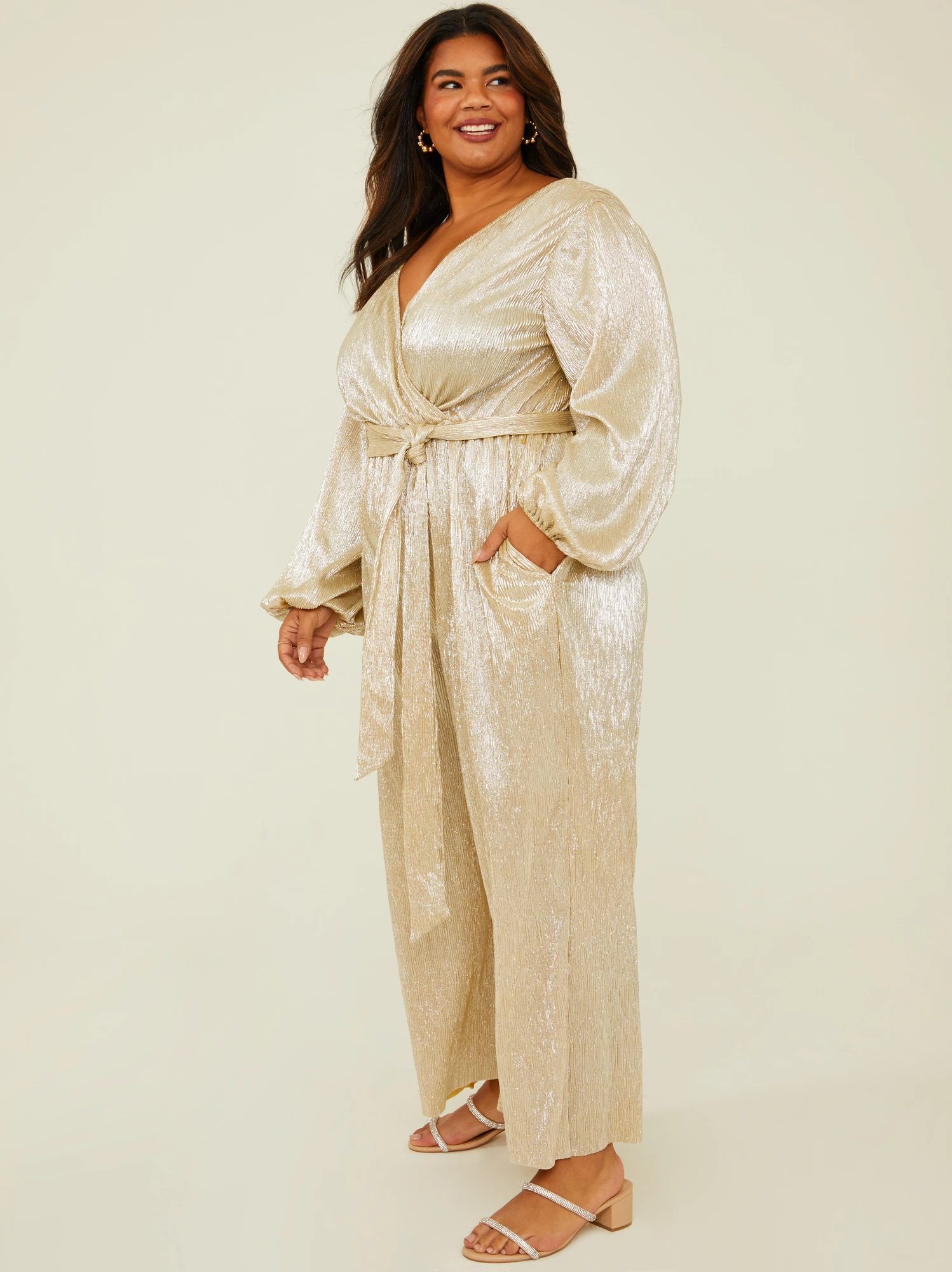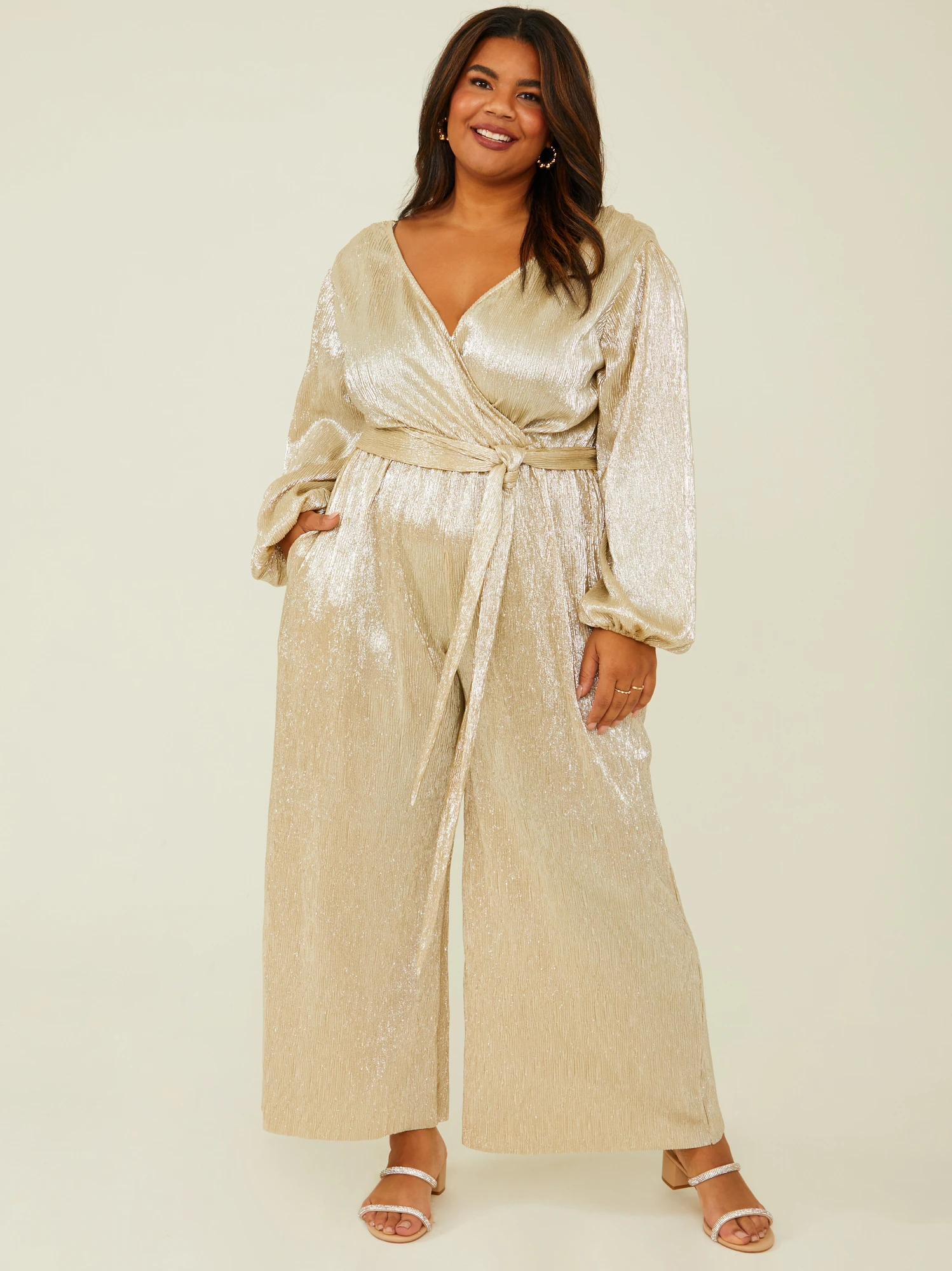 - Ribbed, Removeable belted tie Surplice neckline, Hidden side pockets