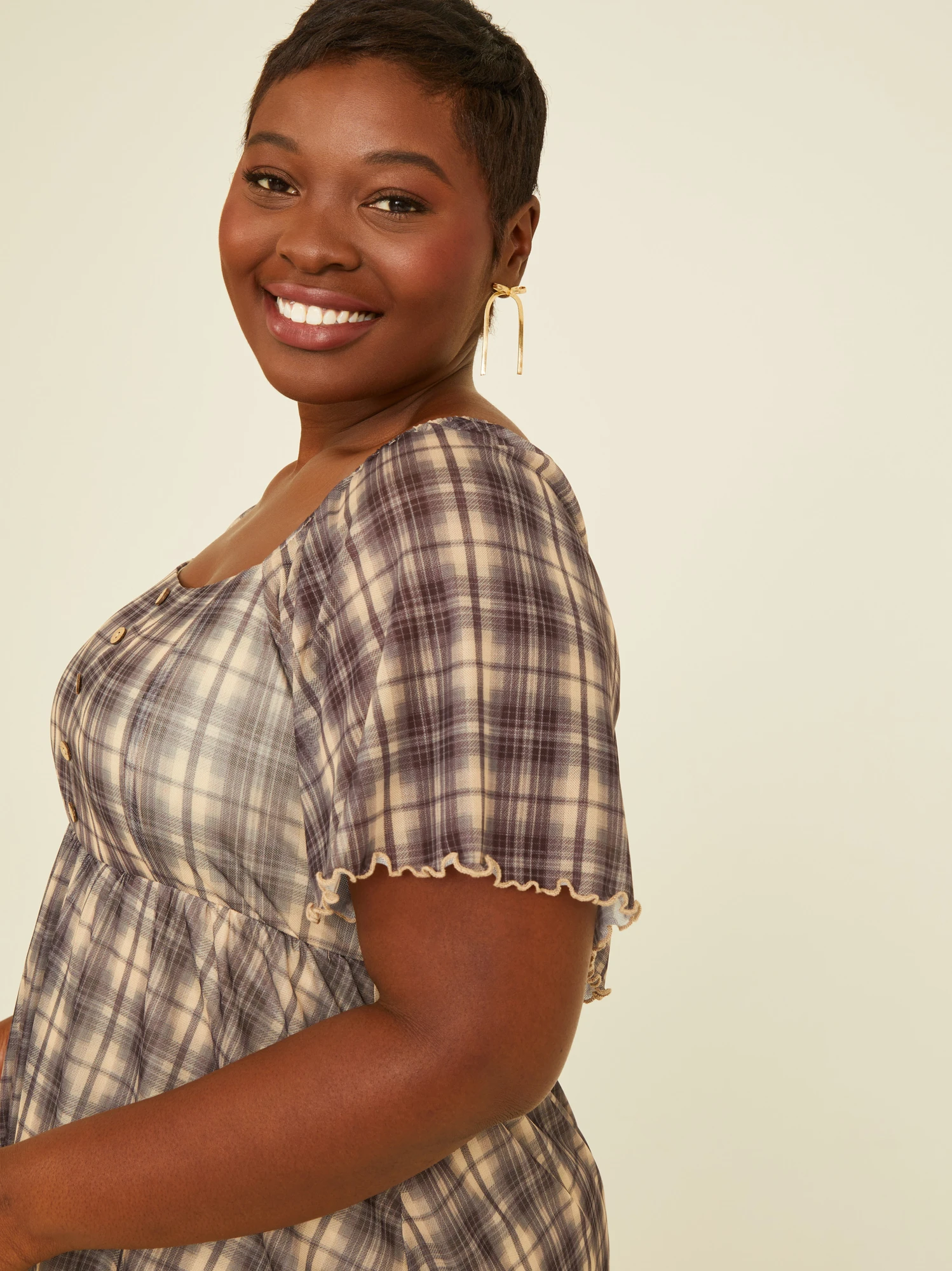 Perfect for transitioning between seasons, this timeless plaid dress will be your new favorite go-to dress for effortless elegance year-round. Adorned with a lightweight, sheer overlay, this dress features a playful meet and greet hemline that adds movement and flair to your look. The dainty lettuce cut hem and neutral buttons add a touch of classic vintage charm.