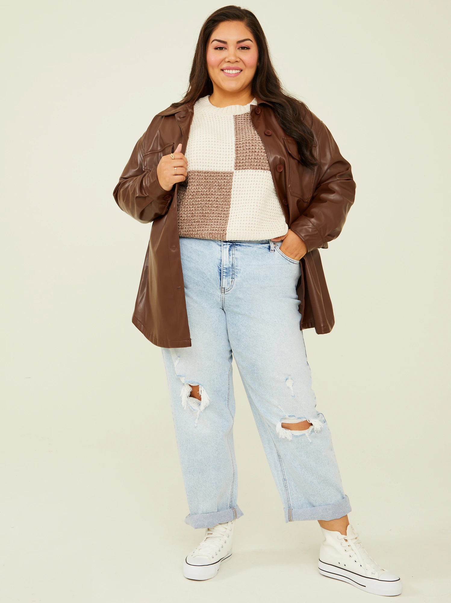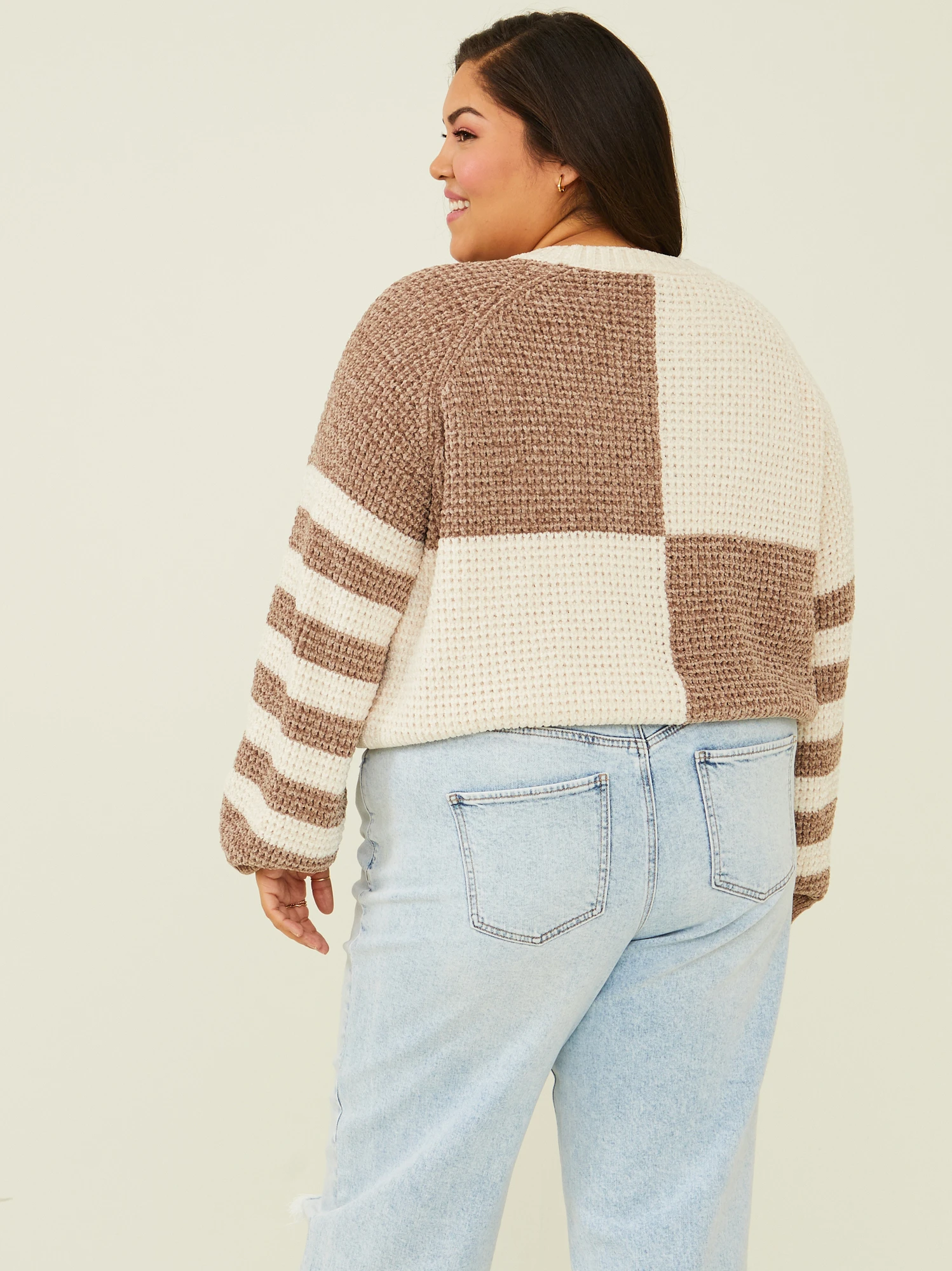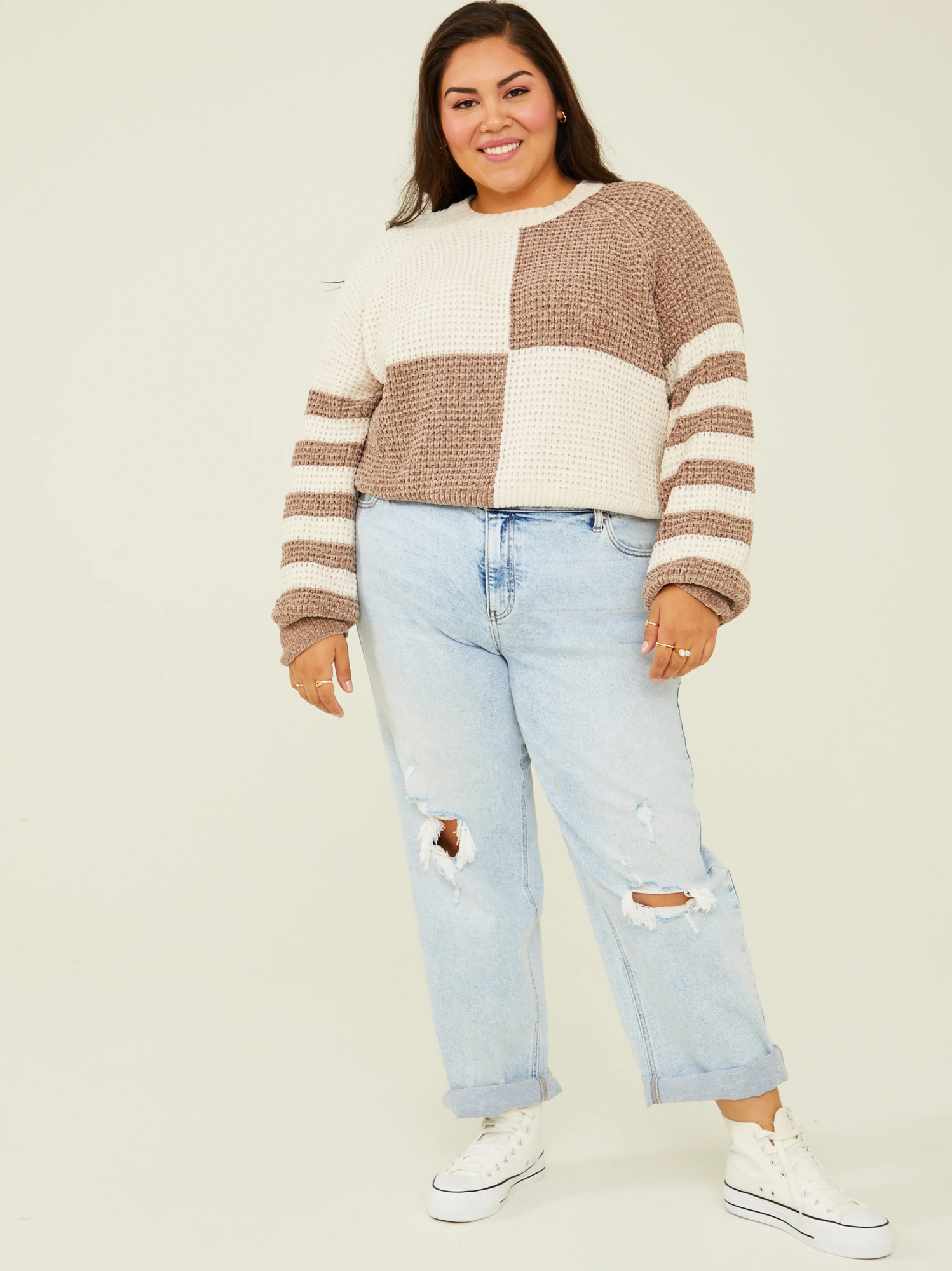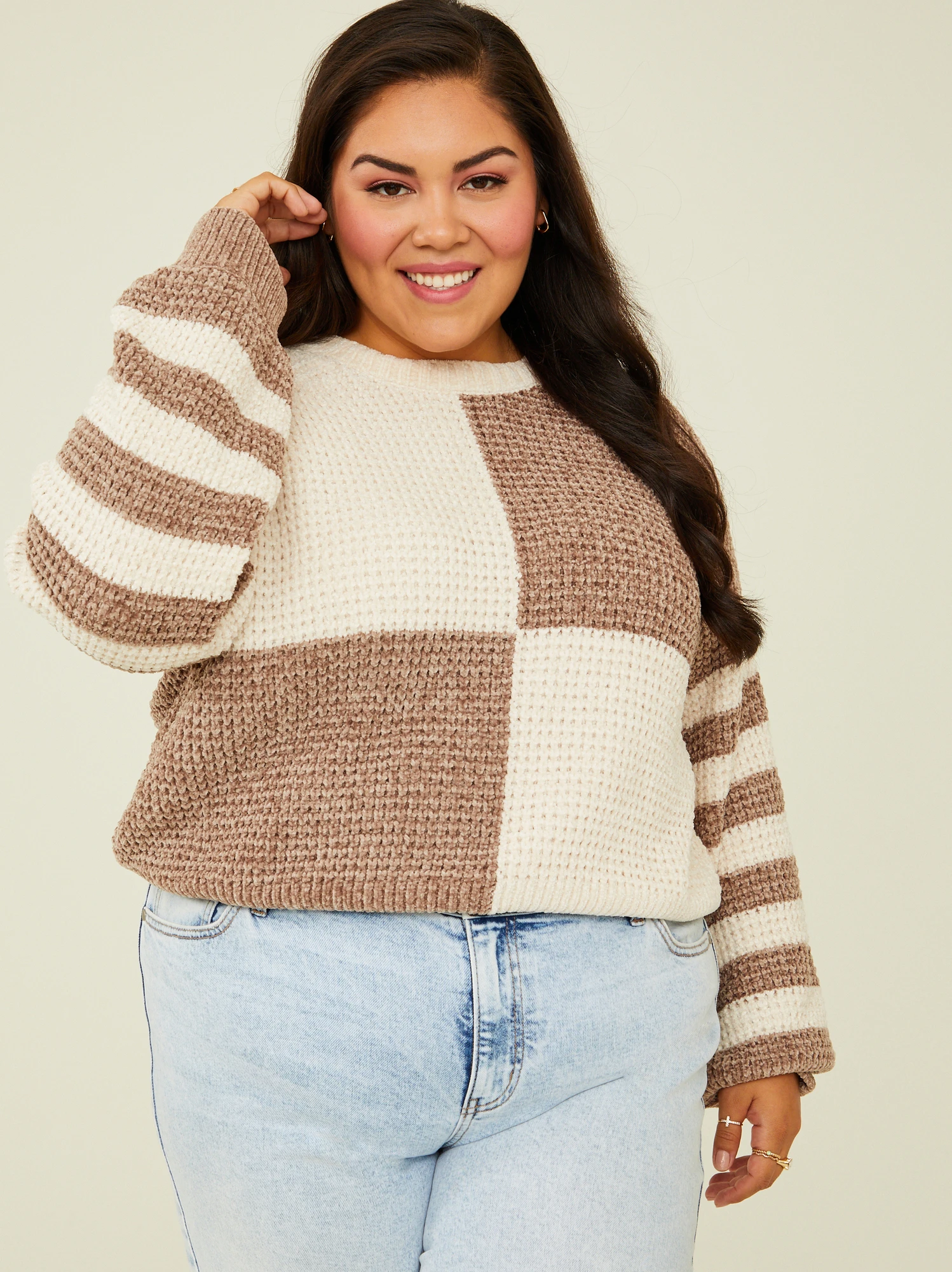 Crafted with meticulous attention to detail, this chenille sweater features a colorblock pattern that adds a touch of modernity and sophistication. In soft, neutral tones, this sweater complements a variety of outfits and occasions. Whether you’re dressing up for a cozy day indoors or heading out for a casual outing, it’s the perfect choice to keep you warm and stylish.