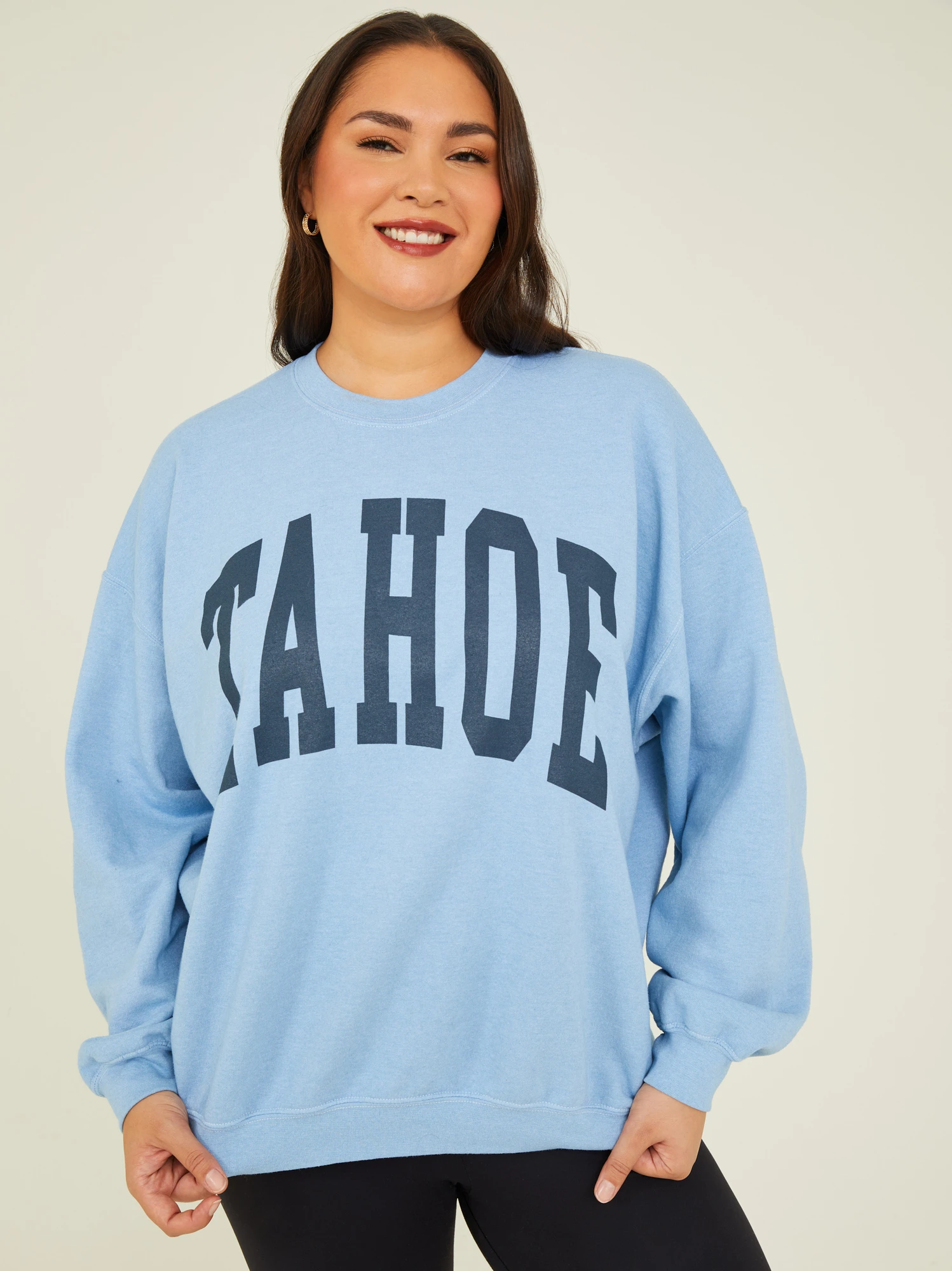 Featuring “Tahoe” proudly displayed in block letters across the front, this sweatshirt showcases your love for this iconic destination. Crafted with a soft touch, this fleece sweatshirt is your go-to choice for a cozy and cute look that complements any relaxed occasion.