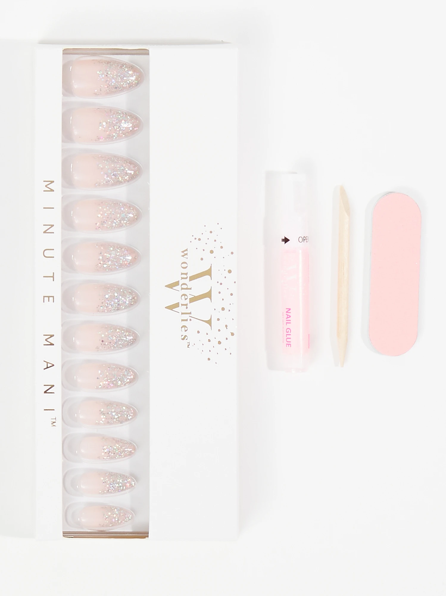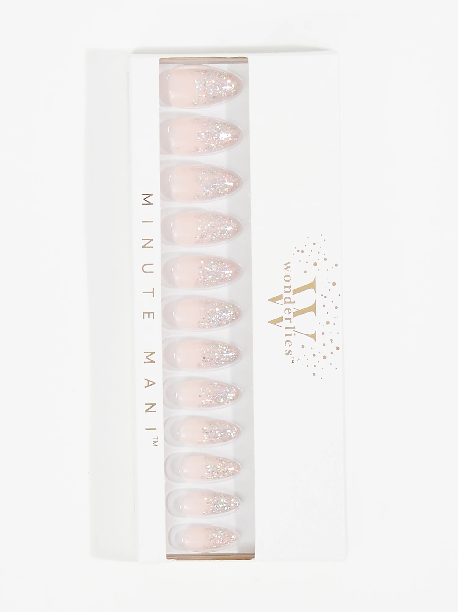 A professional manicure in minutes! Every set of Wonderlies includes 24 nails of 12 different sizes, ensuring they will fit any size nail bed. This design features a nude color with a stunning glitter dipped design!