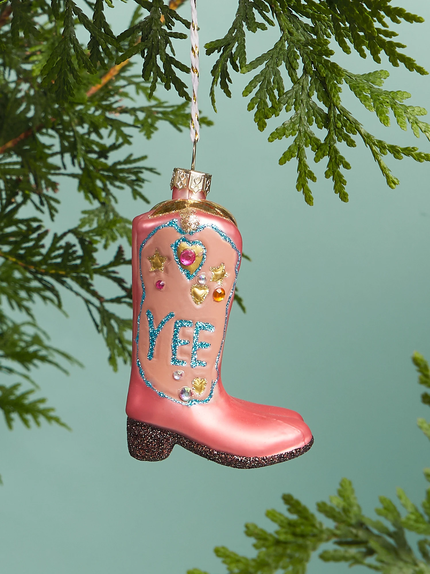 Head out west, cowgirl! This adorable ornament features cute western booties with the perfect amount of sparkle and shine to complement any assortment of Christmas décor.